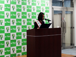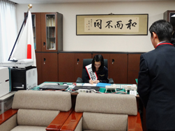 麻布税務署の初代一日署長となった中道さんには、署長室にて委嘱状とタスキの交付、名刺交換、記念品贈呈があり、署長席にて模擬決裁を行いました。また、会議室では、税務署の職員の方々の前で署長訓示(受賞した作文の朗読)があり、その後署内視察等を行いました。