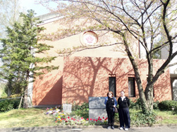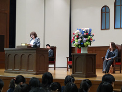 4月17日(水)と18日(木)の二日間で、六本木校地の中高部、小学部、幼稚園、そして横浜校地の大学を訪れ、授業や校舎を見学していただき、生徒たちや教職員との交流の時間を持ちました。また、17日には中高部の英語礼拝でアンスティス・ブロムさんがお話ししてくださり、ご親族からしか伺えないカートメル先生のお話に生徒たちは熱心に耳を傾けていました。