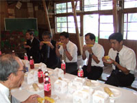 晴れ渡る空のもと、そばの白い花が咲き、りんごの実が色づき始める秋の野尻湖畔の自然の恵みに囲まれながら、施工業者の宮嶋商事・宮嶋社長、古平野尻建築アドヴァイザー、東京YMCA・新井総主事、土谷統括にご参列いただき、学院からは池田守男理事長、各部部長、教職員が参加しました。