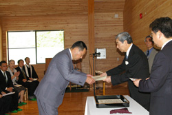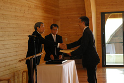 礼拝はⅢ期工事で完成した長野彌記念ホールで行われ、野尻での集団生活の中で友情を学び、雄大な自然のもと神の存在を感じていくことの大切さが語られました。礼拝の後にはすべての改築工事を手がけてくださった宮嶋商事の宮嶋社長、野尻をよく知る保護者としての立場から貴重なアドヴァイスをくださった古平真氏に、学院から感謝状を贈呈いたしました。