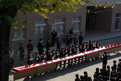 晴れわたる青空のもと、創立125周年記念式が11月6日、六本木の小学部校庭で行われました。式には中高部母の会の招待で、東洋英和に派遣された最後の宣教師ミス・ボールと、学院創設者であるミス・カートメルの御親戚(ミス・カートメルのお兄様のひ孫様)にあたるカーご夫妻をカナダからお迎えしました。