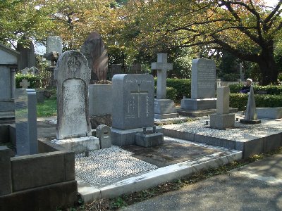 青山霊園には日本伝道に生涯を捧げた宣教師の先生方やその家族のお墓があります。明治以来埋葬された外国人の数は宣教師だけでも90名に及ぶそうです。強盗に襲われ日本で命を落としたラージ氏(東洋英和の二代目校長だったミセス・ラージの夫)、東洋英和の理事でもあり青函連絡船洞爺丸の海難事故で亡くなったストーン牧師なども埋葬されています。