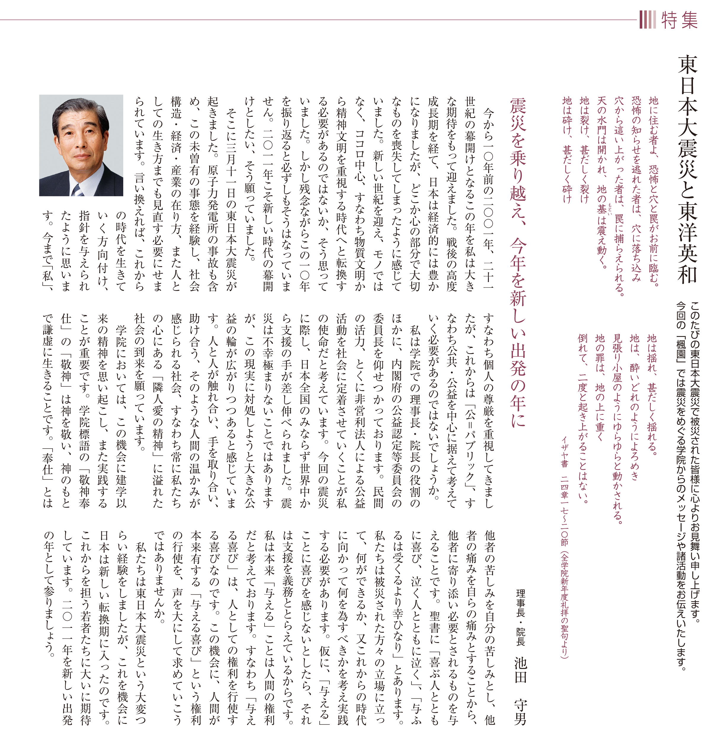 学院報「楓園65号」(2011年9月7日発行)では特集「東日本大震災と東洋英和」で各部の震災対応、学院関係者の活動を報告しています。