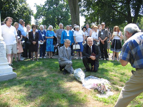 2005年の ミス・カートメル墓石除幕式での有賀先生(左)とアーウィン牧師(右)。今回の翻訳のみならず、英和生のカナダ訪問の際にご手配くださるなど、お二人にはこれまでも東洋英和に多大なご尽力をいただいております。
