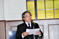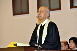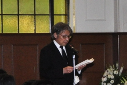 礼拝は、吾妻國年副院長の司式で行われ、讃美歌、聖書朗読、中高部合唱部による奉唱の後、学院常務理事(教学担当)の大宮溥牧師が式辞を述べました。そして、キリスト教学校教育同盟理事長 佐藤東洋士様、後援会会長 金子栄一様、同窓会会長 松本幸恵様、村上陽一郎学長・副院長からのお別れの言葉の後、故人愛唱の讃美歌312番「いつくしみ深き」を一同で讃美しました。