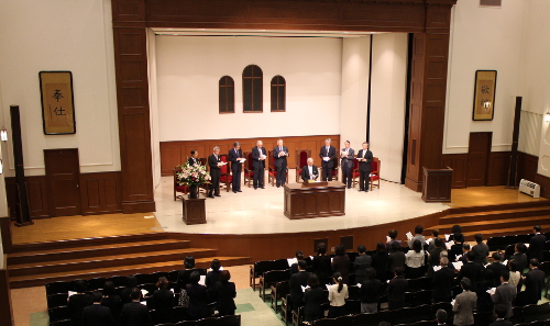 9月27日(金)17時より、新マーガレット・クレイグ記念講堂において、水澤郁夫理事長(7月1日就任)と深町正信院長(10月1日就任)の就任式が執り行われ、来賓および学院関係者約110名が出席しました。