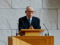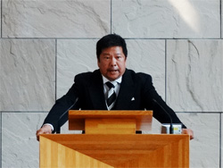 就任式は、大学宗教主任の三上章牧師の司式で行われました。讃美歌、聖書朗読、吉岡良昌大学宗教主任による祈祷の後、水澤郁夫理事長と深町正信院長の挨拶に続き、池田明史学長が就任の辞を述べました。
