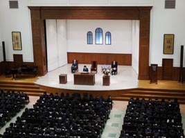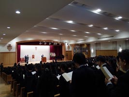記念式は、東洋英和幼稚園の園児、小学部の児童、中高部の生徒、大学・大学院の学生代表、教職員、ご来賓の方々が集い小学部校庭で行う予定でしたが、雨のため、小学部講堂と中高部の新マーガレット・クレイグ記念講堂に分かれて行いました。