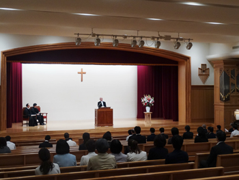 就任式は、学院宗教部長(六本木校地)の髙橋貞二郎牧師の司式で行われました。讃美歌、学院宗教部長(横浜校地)の深井智朗牧師による聖書朗読と祈祷、西田哲也法人事務局長による紹介の後、大宮理事長が就任の辞を述べました。そして、深町正信院長と露木美奈子高等部長が祝辞を述べました。 大宮理事長による就任の辞は、次号の学院報「楓園」(9月中旬発行)に掲載いたします。