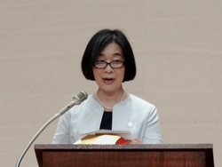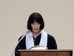 就任式は、髙橋貞二郎学院宗教部長の司式で執り進められ、伊勢田奈緒学院宗教部長による聖書朗読、祈祷の後、西田哲也法人事務局長より増渕理事長の紹介がなされました。次に池田明史大学学長が証人代表として立ち、増渕理事長が初代校長ミス・カートメルの聖書に手を置いて誓約を行い、会衆による誓約の後、祈祷が捧げられました。次いで、増渕理事長による就任の辞の後、深井智朗院長、楠山眞里子高等部長が祝辞を述べました。