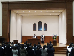 4月12日(金)、新マーガレット・クレイグ記念講堂において全学院新年度礼拝が行われ、幼稚園、小学部、中高部、大学・大学院、法人事務局の教職員約150名が出席しました。