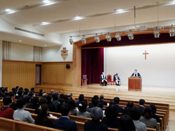 12月6日(金)17時より全学院クリスマス礼拝が小学部講堂で行われ、幼稚園、小学部、中高部、大学、法人事務局の教職員約130名が出席しました。今年度は日本基督教団銀座教会協力牧師であり、本学院の評議員でもある近藤勝彦先生をお迎えし、「羊飼いのクリスマス」と題して説教をしていただきました。