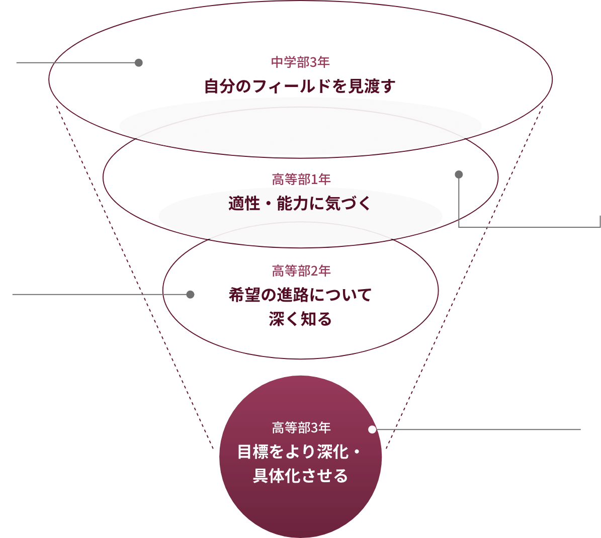 中学3年から自らの進路・将来について考えるプログラムが始まります。学年に応じたプログラムを通じて考えを深め、卒業後の学び、仕事、生き方、将来の進路について目標を明確にしていきます。単に大学への合格を目標にするのではなく、将来を見据え、自分の進路に合った大学選びを進めていきます。