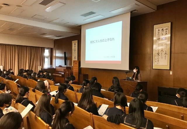 受験体験の講演会 (高3)文系・理系・芸術系に分かれ、英和ならではの多様な進路についての実践的な体験談を卒業生から聴きます。