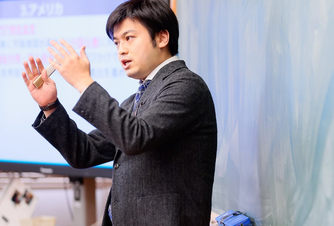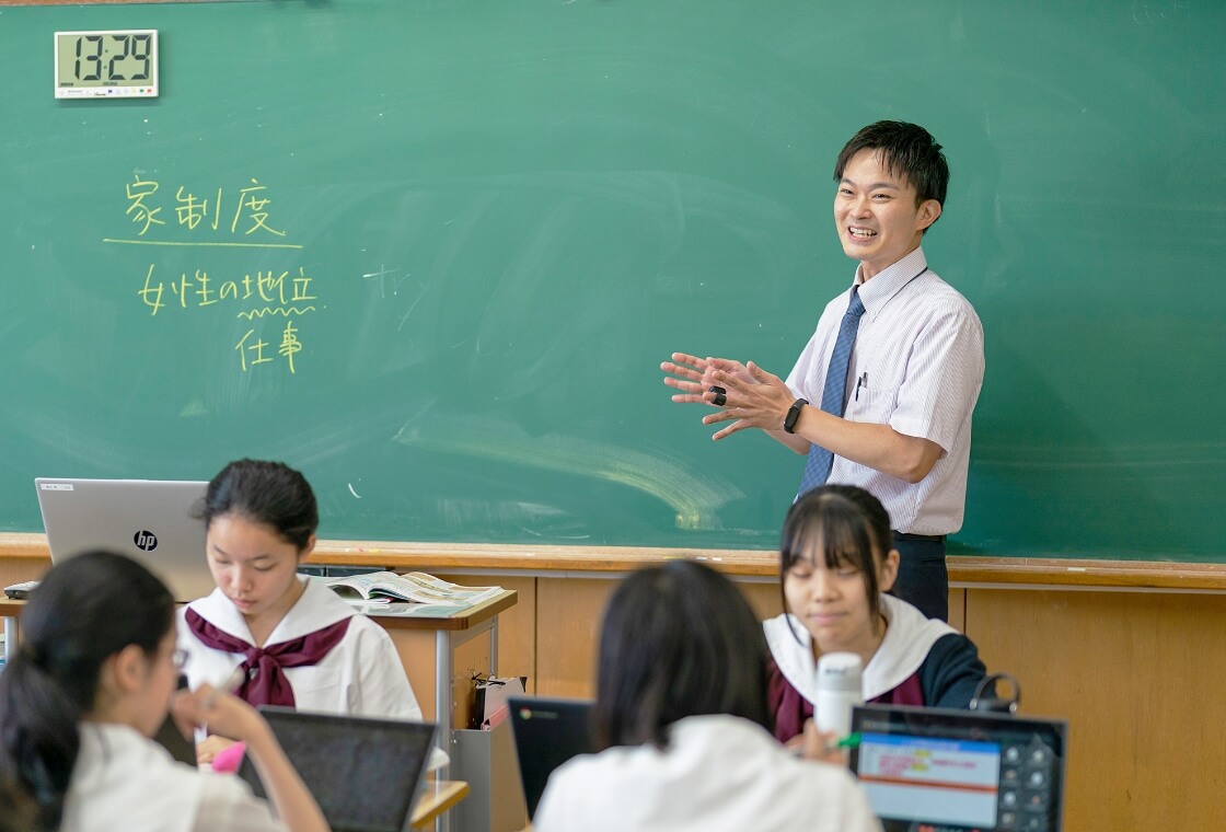 まず興味をもち、社会を身近に捉えられるように、"見て・聞いて・触って"といった体験的な教材を取り入れながら授業が進められています。総合的に捉えて考えることを大切に、必要に応じて高校の内容も先取りした学習を行っています。