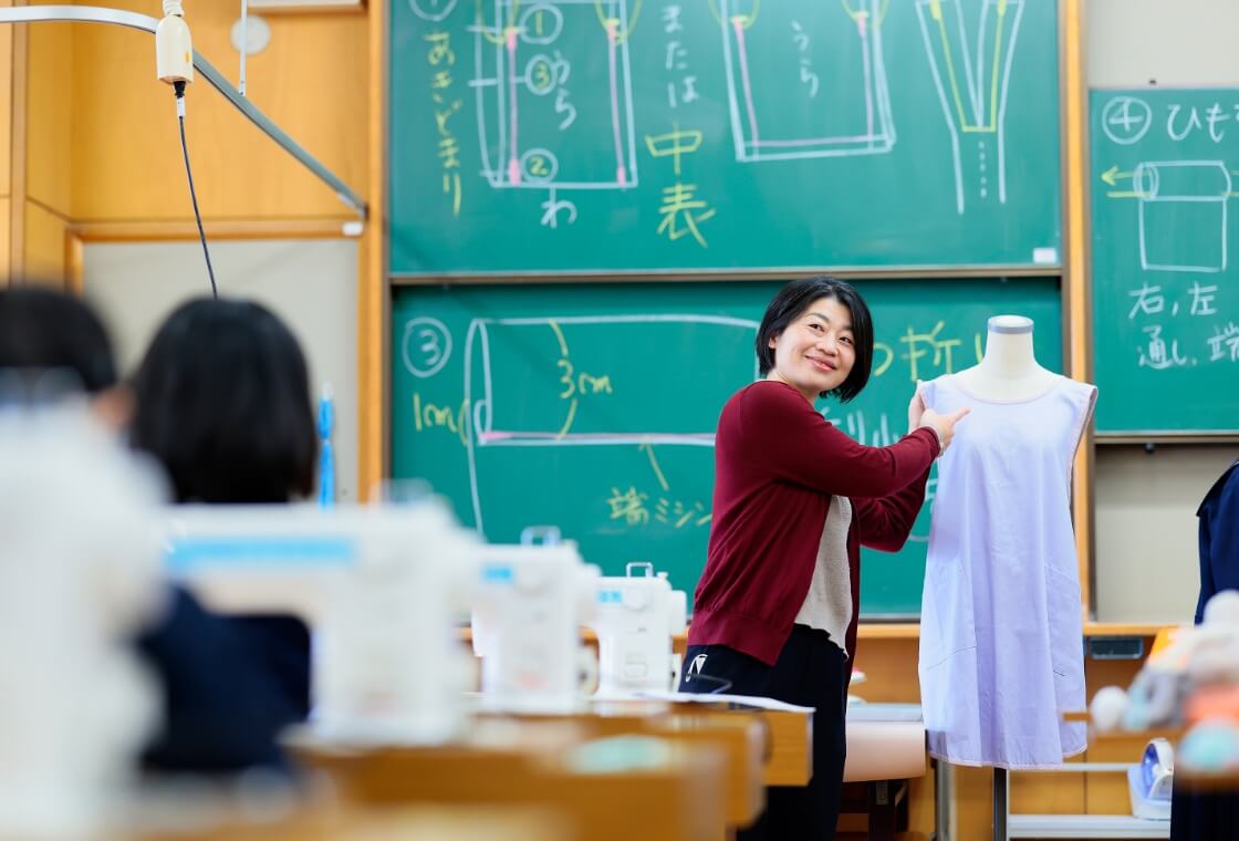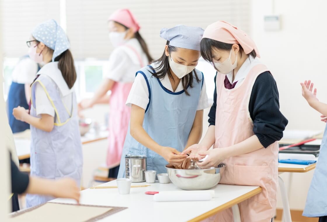 衣・食・住といった単元毎に、実践的・体験的な学習を行い、もの作りの楽しさ、他者のために生かされる喜びを感じながら、よりよく生きる力を養います。おもに実習の授業ではチームティーチングによってきめ細かい指導を行っています。