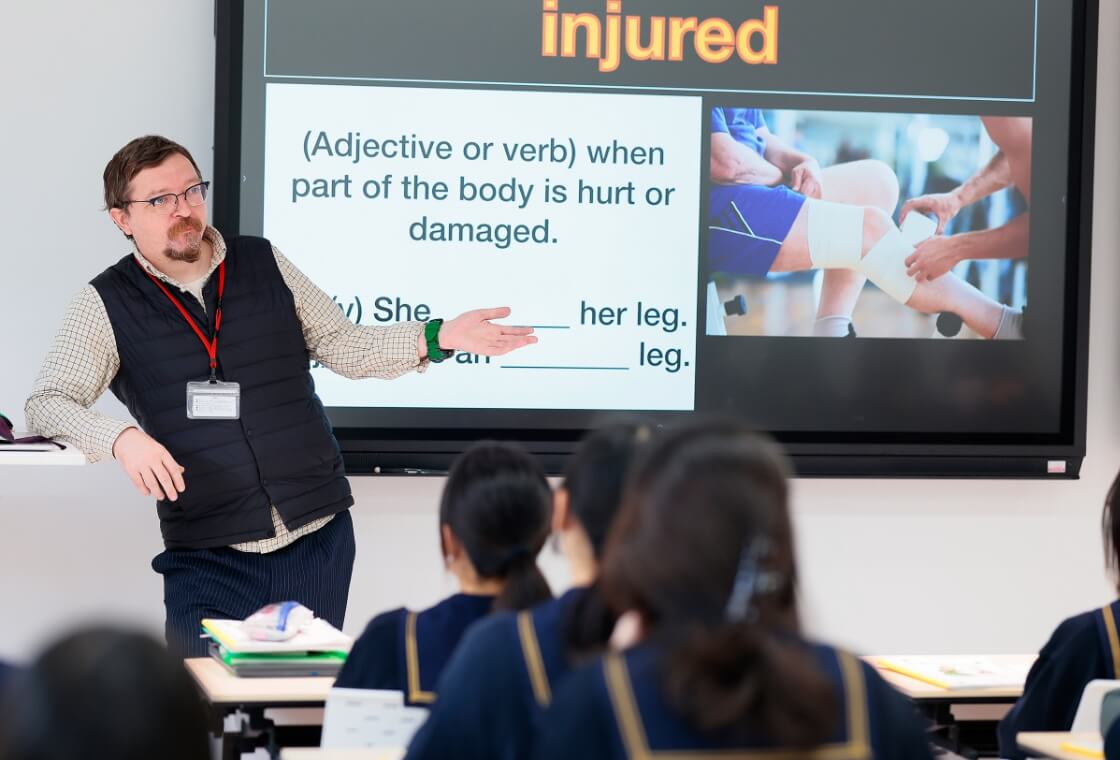中1は週2時間、中2、中3は週1時間のネイティブの教師による英会話授業があります。オリジナルのテキストとホームページを使い、生徒の生活に合った内容の英会話を学びます。更に学びたい生徒は中3から放課後の課外英会話科に参加できます。