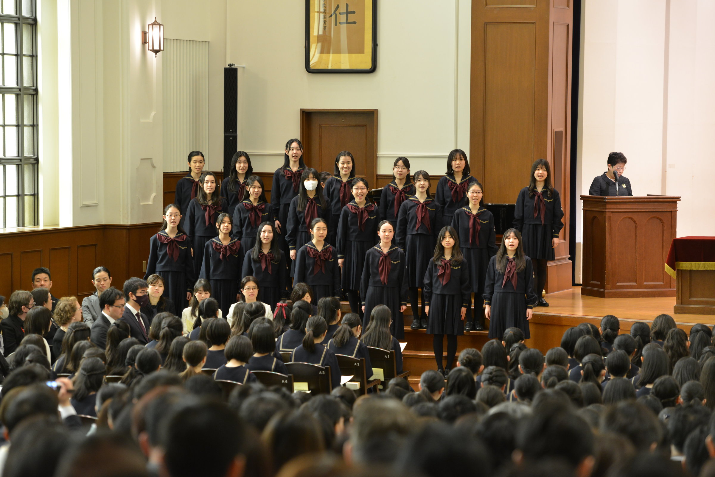 新入生が校歌を歌えるように、合唱部の皆さんが歌ってくれました。