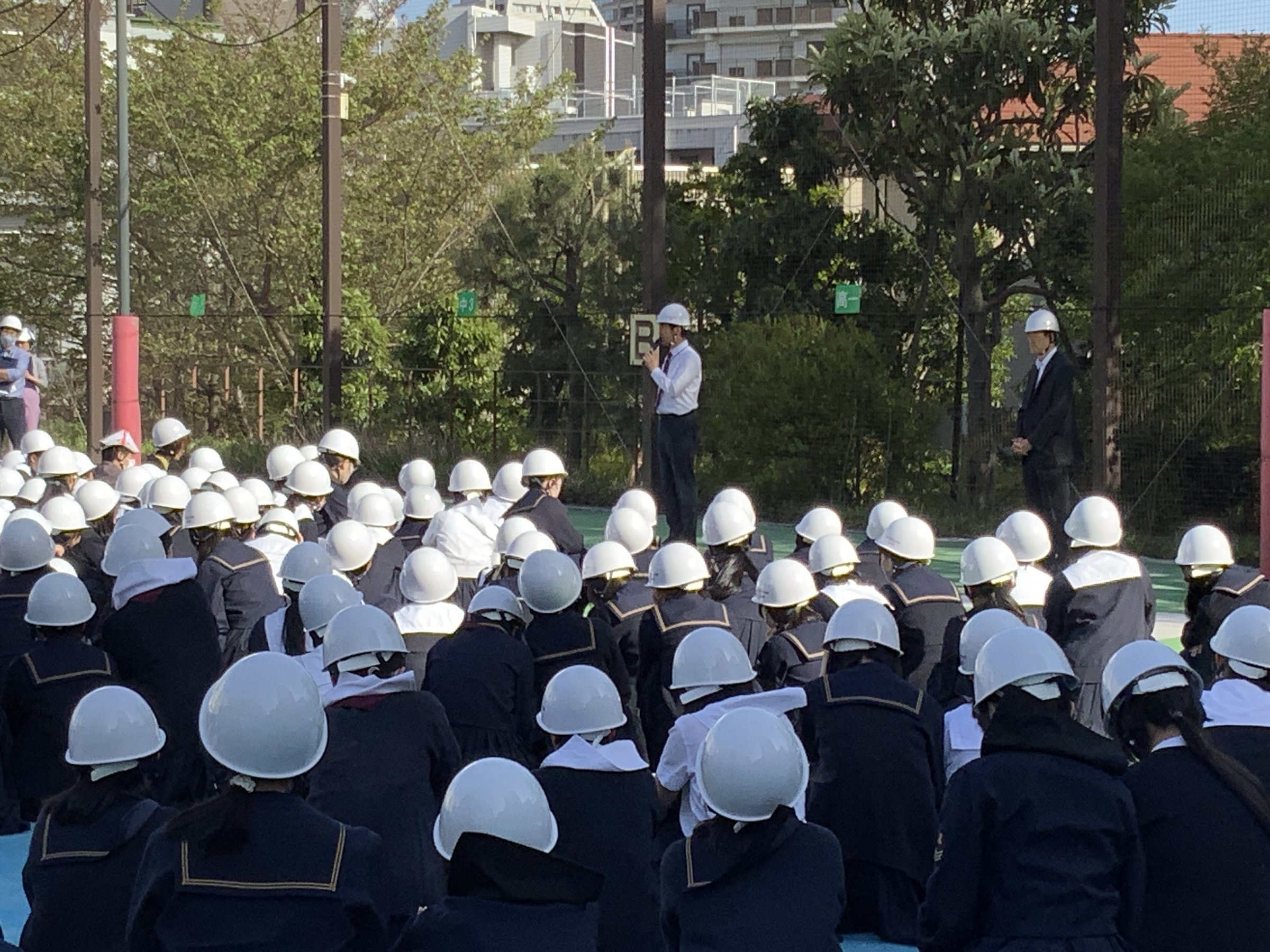 4月の避難訓練は、新しい教室からの避難経路を確認する大切な機会です。入学したばかりの中学1年生は、ヘルメットの装着もしっかり練習しました。