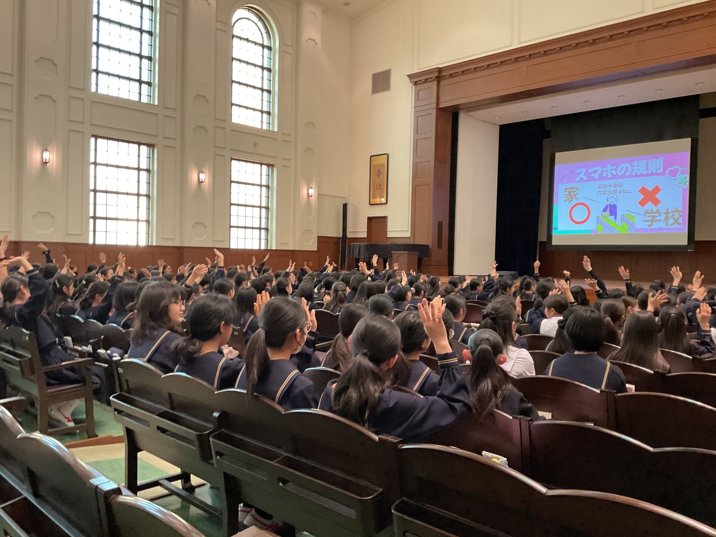 そこで新入生に向けて、携帯電話・スマートフォンの使用ルールをクイズ形式で確認しました。