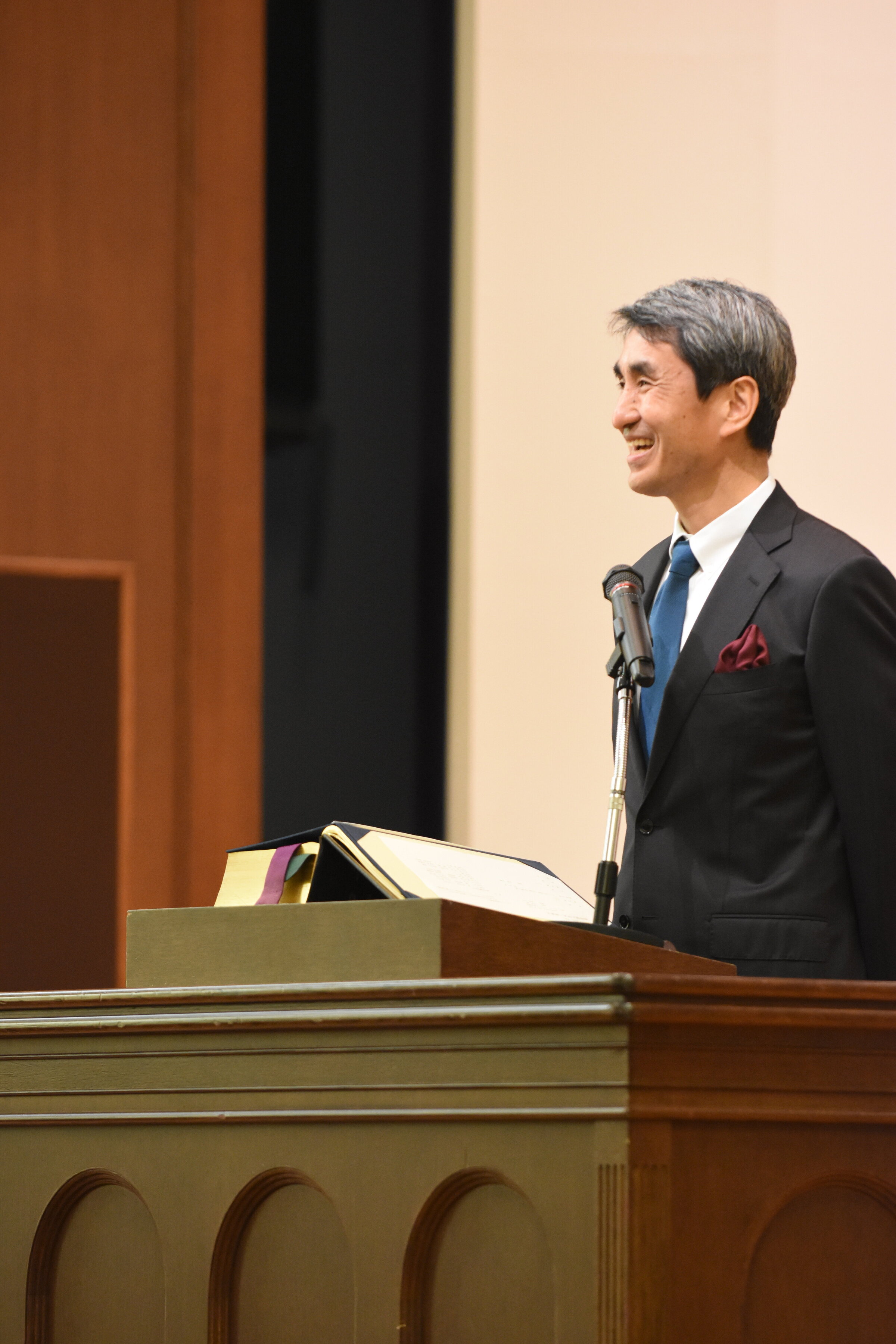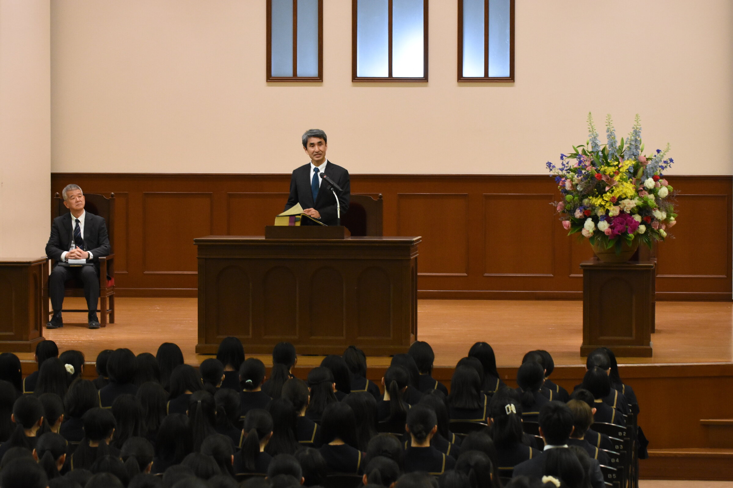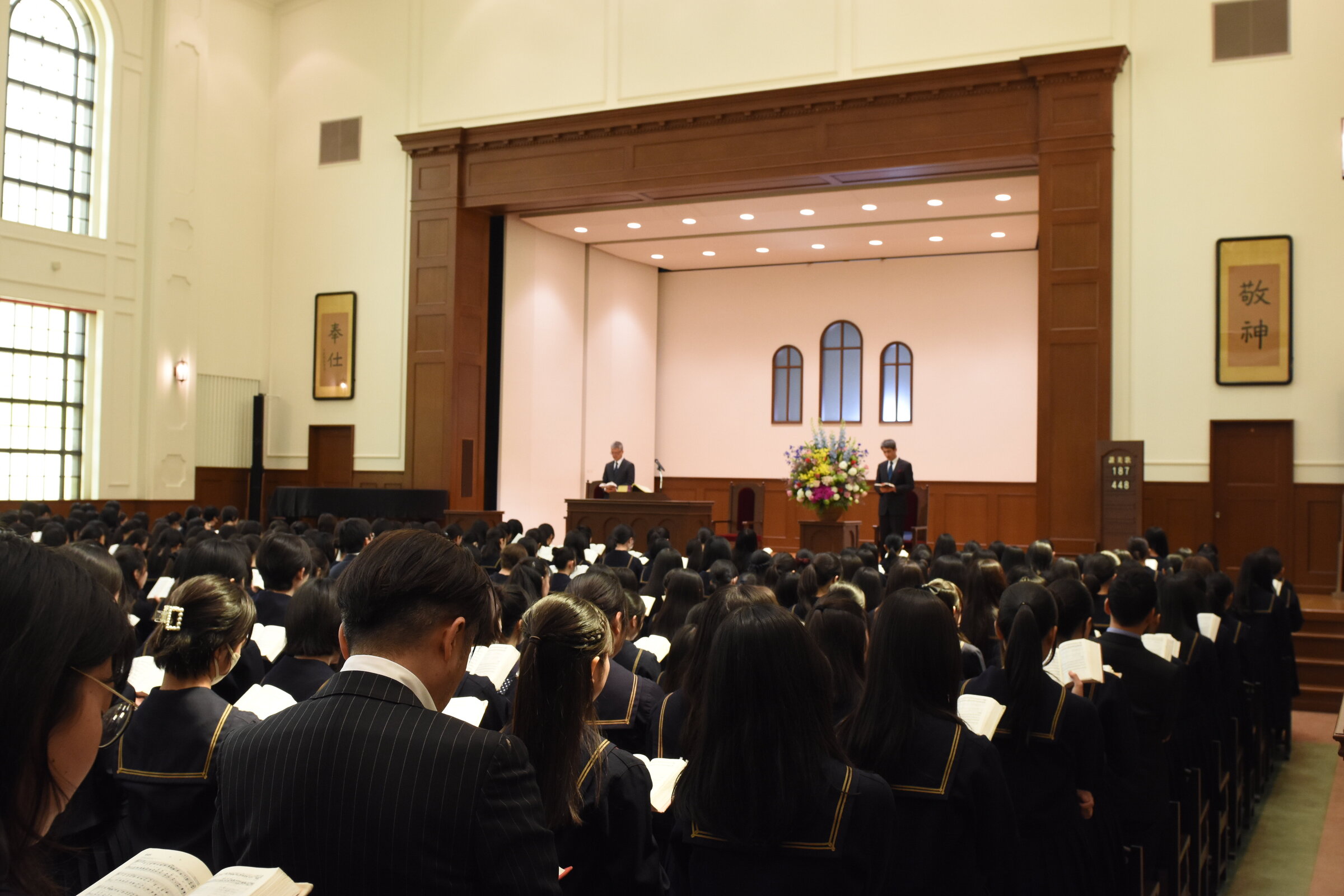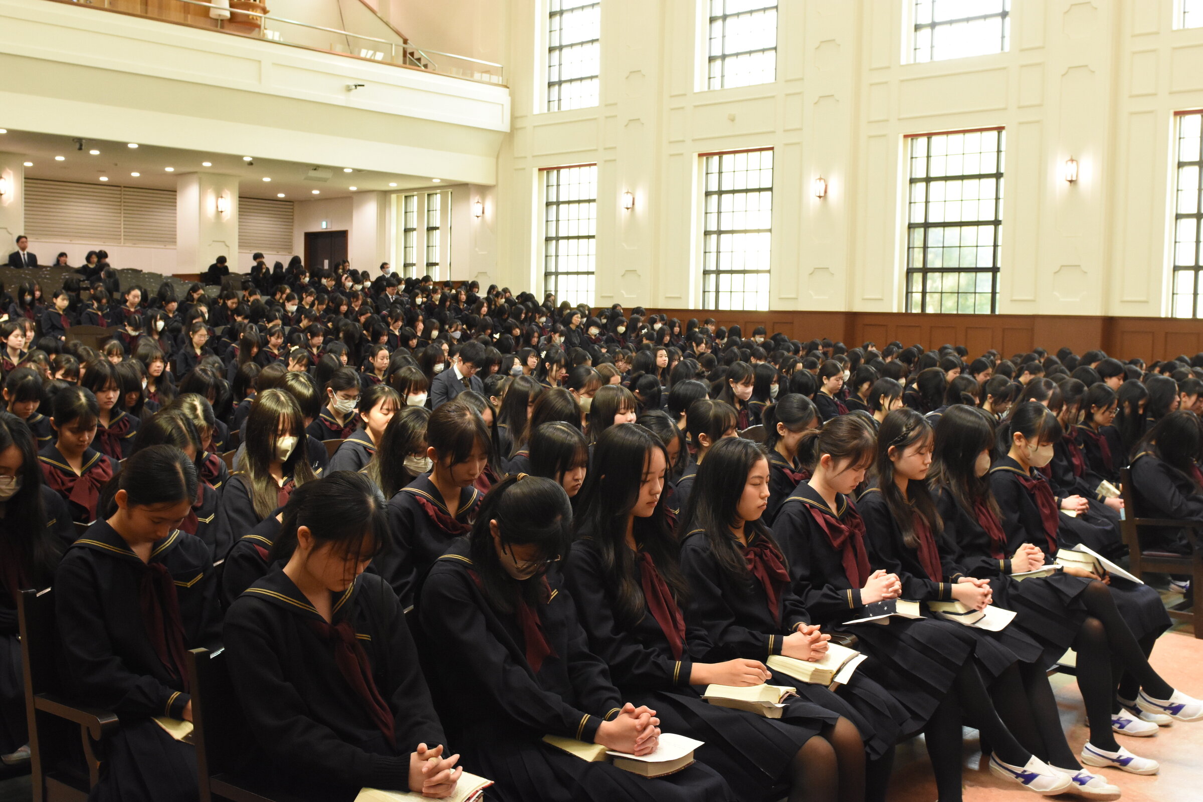 新年度最初に皆で歌う讃美歌。高校生の豊かな歌声による讃美が大講堂に響き渡りました。
