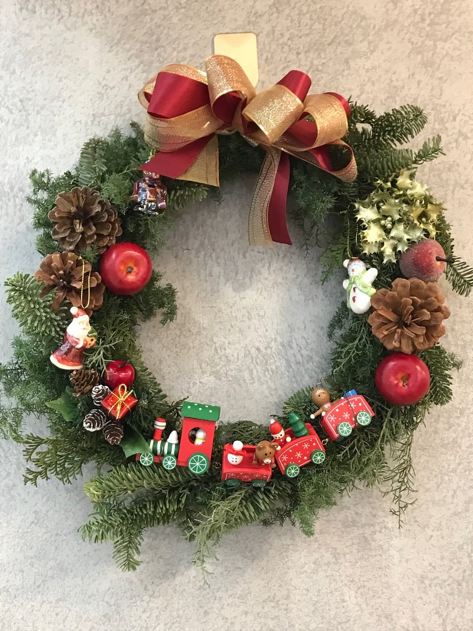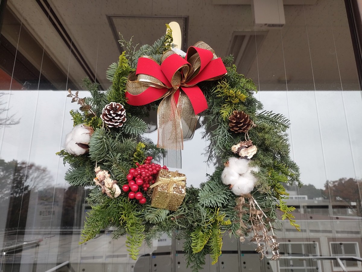 クリスマスリースは学内各所に飾られています。葉っぱ、木の実、綿、果物、リボン、人形、プレゼントボックスなどがあしらわれています。お気に入りのリースを探すのも楽しいかもしれません。リースは主に各建物の入り口に飾られています。