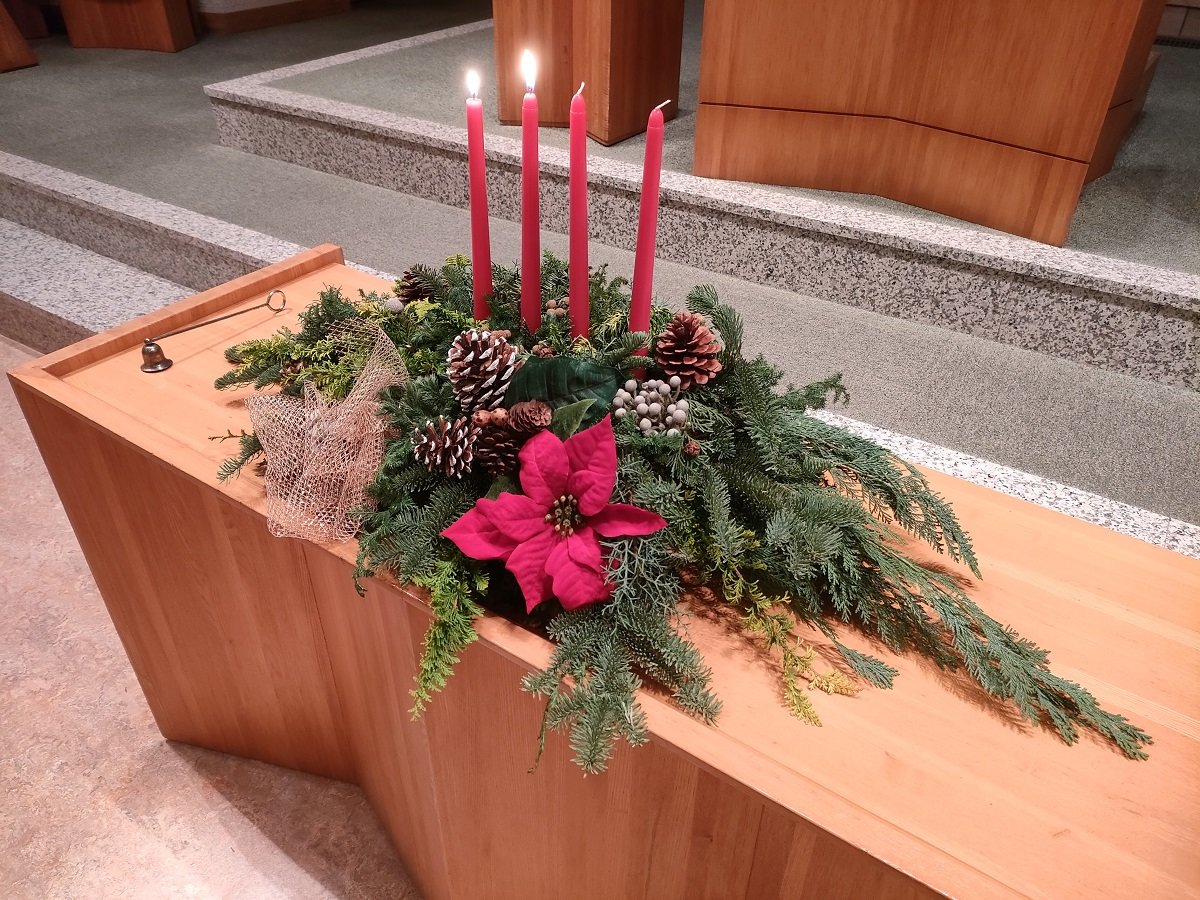 アドヴェントクランツは礼拝堂に飾られています。毎週水曜日の対面礼拝毎にろうそくの灯が1本ずつ増え、4本のろうそくに火が灯るクリスマスが近付いていることを実感させてくれます。