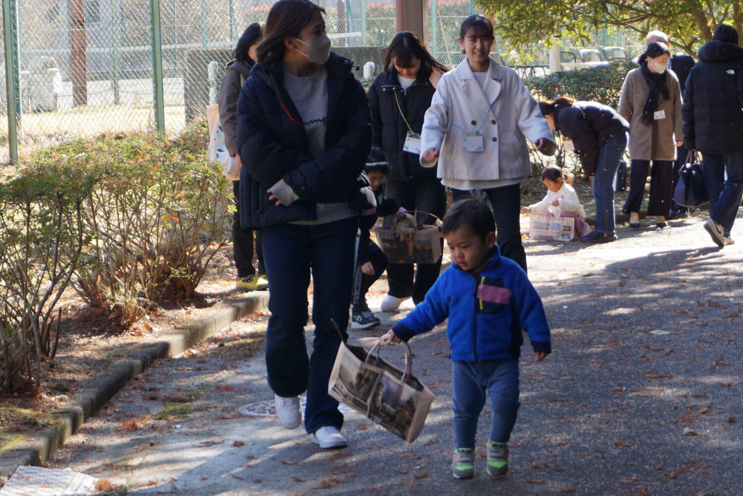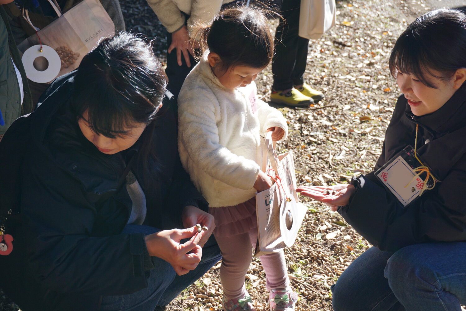 当日は天候に恵まれ、参加者たちは森を散策しながら、冬ならではの自然の恵みにふれ、観察を楽しみました。英和生から植物の説明を受けたり、珍しい木の実を見つけたりする子どもたちの表情は、生き生きとしていました。子どもたちは夢中になって様々な色や形の落ち葉、花びら、ドングリなどを拾い、英和生が準備した新聞紙エコバッグに大事に入れて、図工室に持ち帰りました。