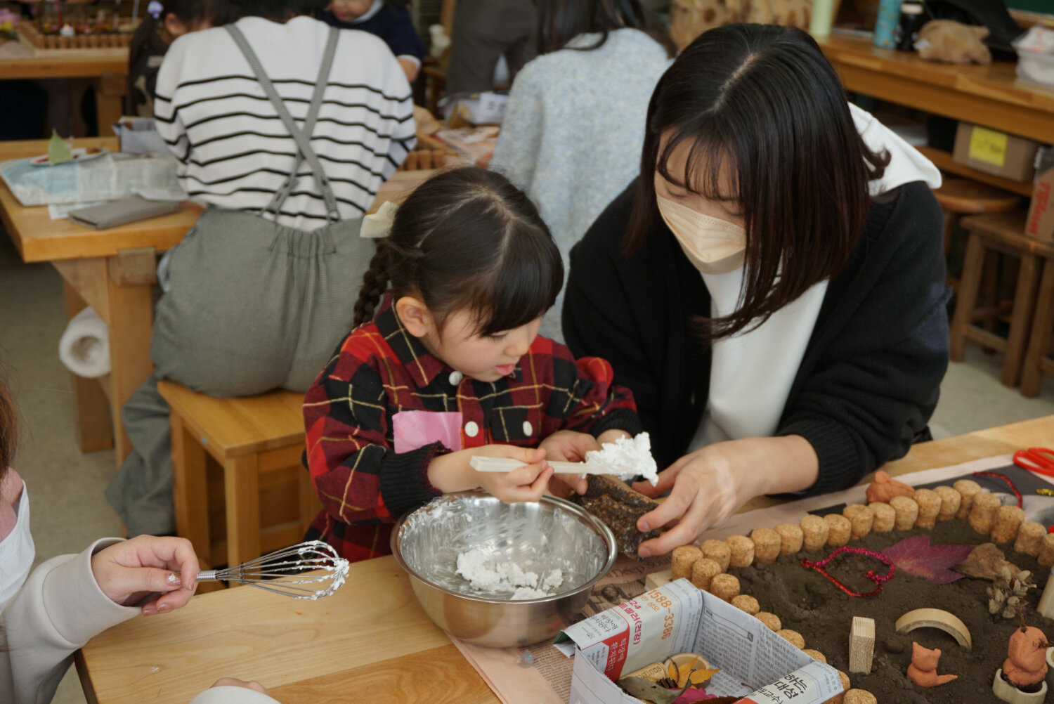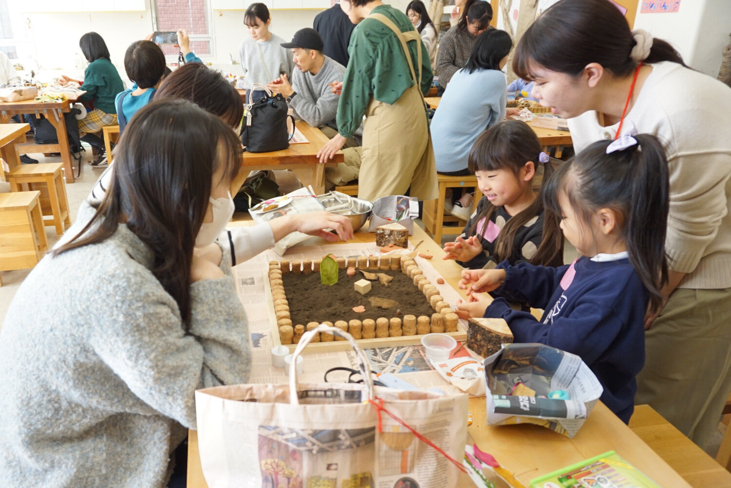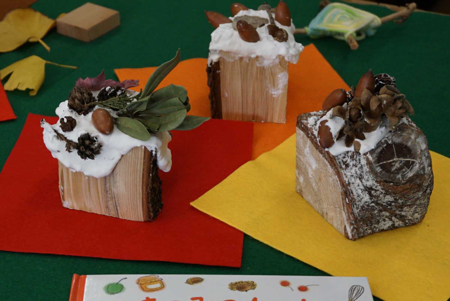 図工室では、それぞれが集めた素材を使い、家族で箱庭をつくってあそぶ時間となりました。他の素材(粘土、木材、竹、毛糸など)と自由に組み合わせ、想像力豊かに表現された『家族の庭』を、最後には全て並べてつなげ、鑑賞も楽しみました。長いスギの葉を橋にしたり、竹をトンネルにしたり、花びらを敷き詰めたり、枝と葉で樹木の姿を蘇らせたりするなど、どの庭も個性的で、子どもたちの想像力と創造力の豊かさに、英和生もわくわくさせてもらいました。さらに、モミノキを土台にして、粘土でクリームをこねて、飾りつけた「木の実のケーキ」も時間と手間をかけて手づくりを楽しみました。