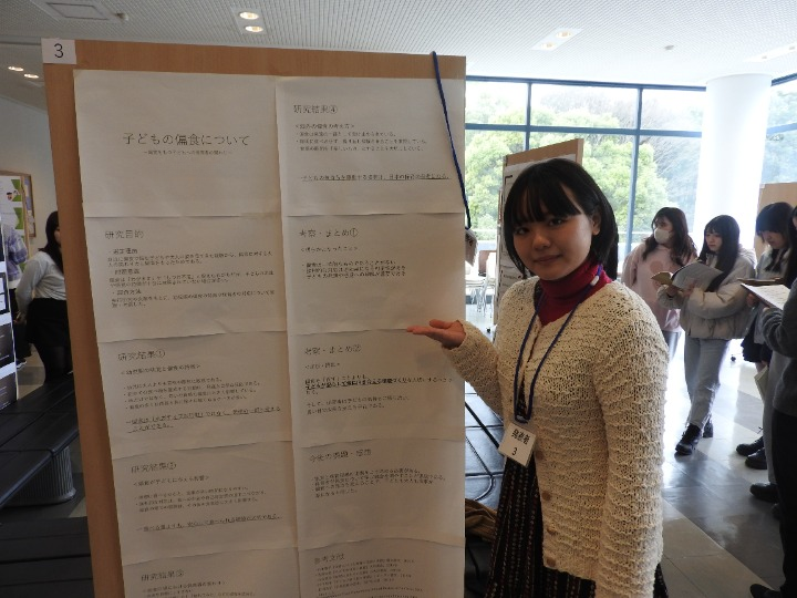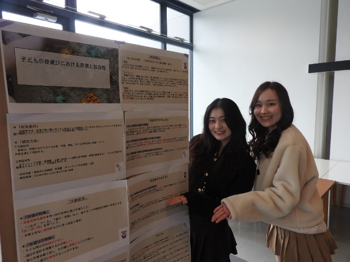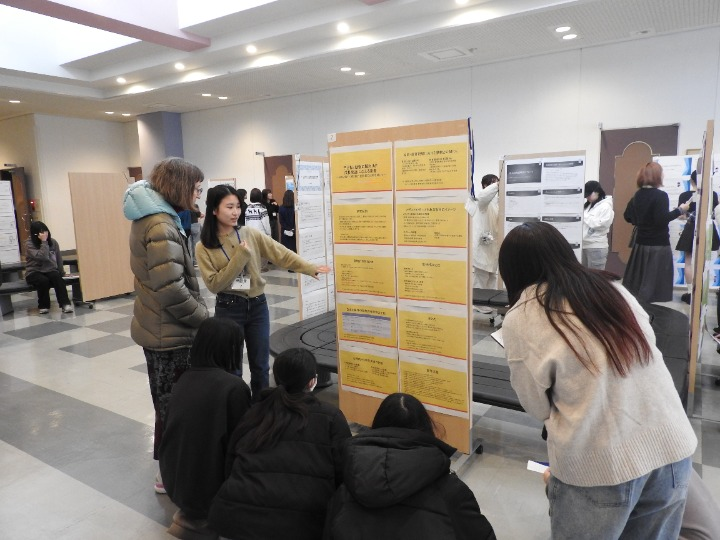 午前中は 5号館2階ロビーにて、学生一人ひとりが自身の研究をまとめたポスターを掲示し、来場した同級生・後輩・教職員に向けて説明しました。質疑応答も活発に行われ、保育の視点から広がる多様なテーマが並び、保育の魅力や子どもの成長に寄り添う視点の大切さを実感できる場となりました。