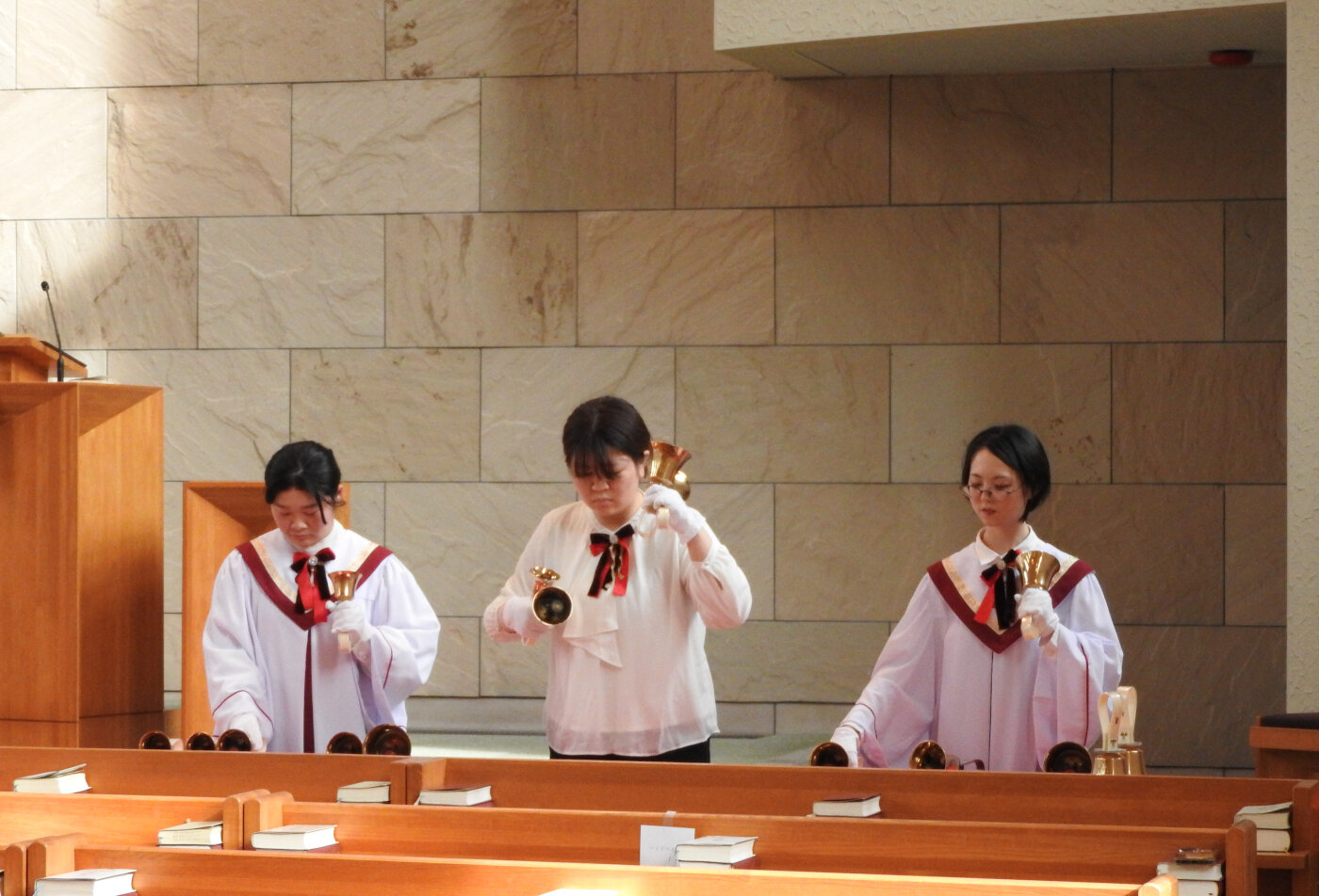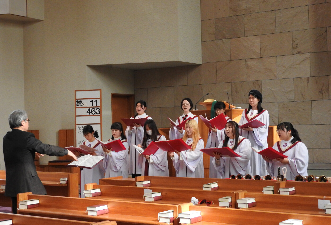 第1部は礼拝で、野田美由紀学院宗教部長が司式・説教、武田ゆり大学オルガニストが奏楽を担当しました。ハンドベル部・聖歌隊の賛美奉献もなされ、聖書の言葉に耳を傾けながらこれまでの歩みを感謝しつつ、これからの歩みについて思いを巡らせる厳かな時間を過ごしました。最後に校歌を歌い、締めくくりました。