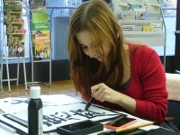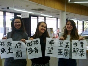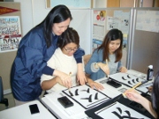 「とめ」「はね」「はらい」から練習を始め、慣れない筆に戸惑いながらも、名前や国名を漢字で書いたり、好きな言葉を書いたり、母国には無い文化を楽しみました。何度も挑戦し、最後にはお気に入りの一枚を、上手に仕上げることができました。