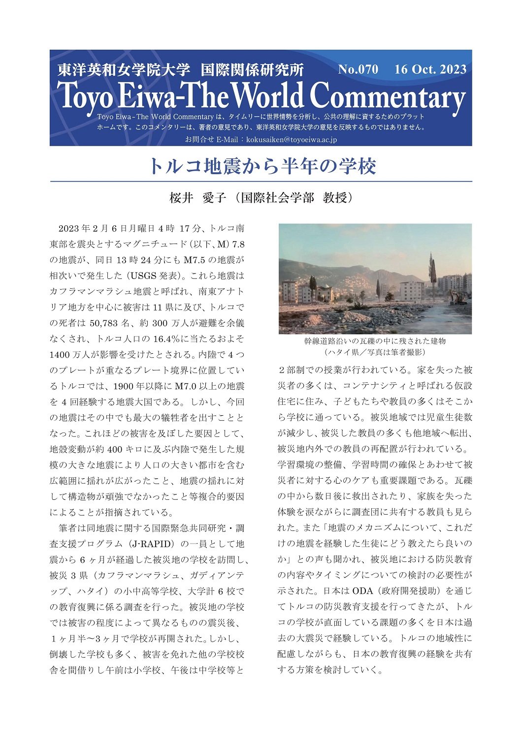 国際社会学部 桜井愛子 教授 執筆『トルコ地震から半年の学校』
