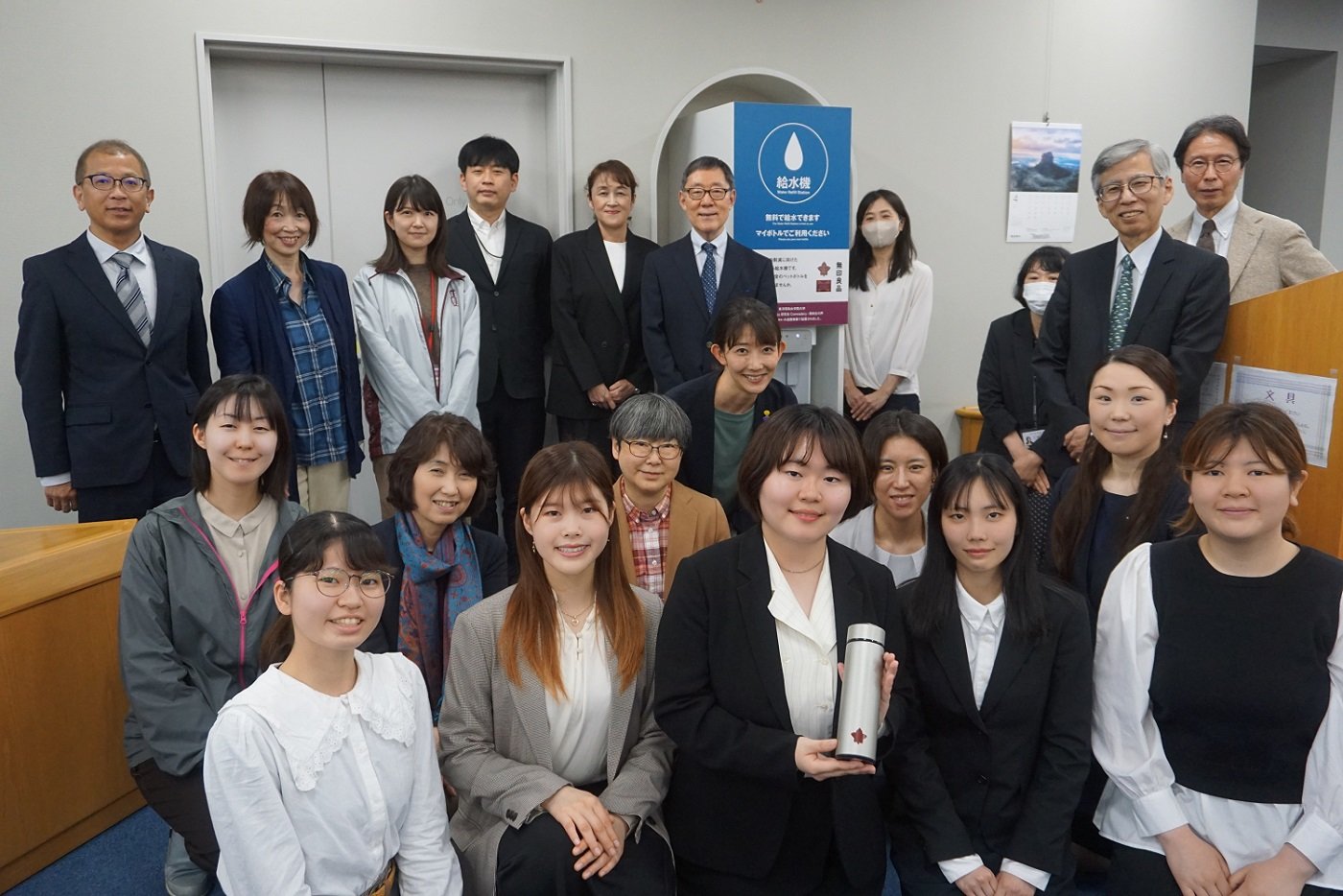 楓美会(大学同窓会)は、学生から学内貢献をしたいという熱意ある相談を受け、「学内の学生そして、これから英和を訪れてくださる方により良い環境を提供したい」という思いから、学生と共に学び連携する方針のもと様々な支援を行っています。学生への事前指導、プレゼンテーションのノウハウのレクチャー、設置にかかる諸費の寄付などを行いました。オリジナルマイボトルを作成し、手軽に学生が給水器を利用できるように活動を展開しています。
