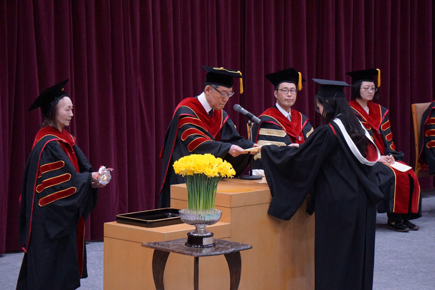 式典後には、卒業生一人ひとりに卒業証書・学位記、そして本学院の卒業式で新たな旅立ちを迎える卒業生に贈られてきた黄水仙が手渡されました。