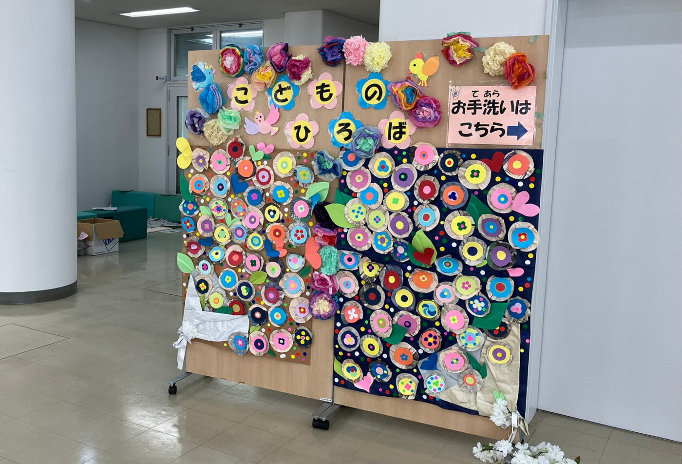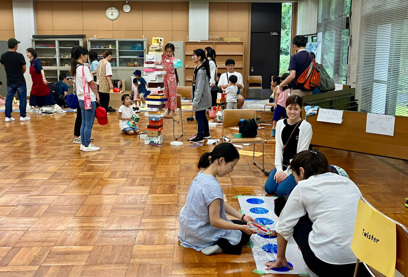 今回は「英語で遊ぼう」をテーマにした企画と星准教授の3年ゼミの学生を中心とした手作り遊具での遊び場、各回定番の自由遊びのコーナーを設けて8号館ロビーと8103教室で行いました。