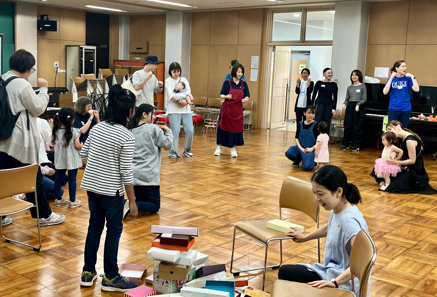 「英語で遊ぼう」では、ピアノ演奏に合わせて英語の歌を振り付けながら歌いました。小さな赤ちゃんはお母さんに抱っこされながら音や動きを楽しんでいました。英語でのゲームは学生たちが子どもたちにできるだけ英語で声かけしながら、一緒に楽しみました。