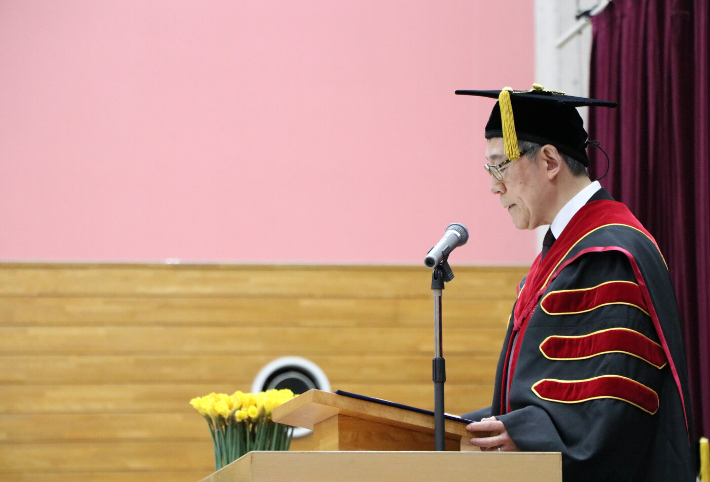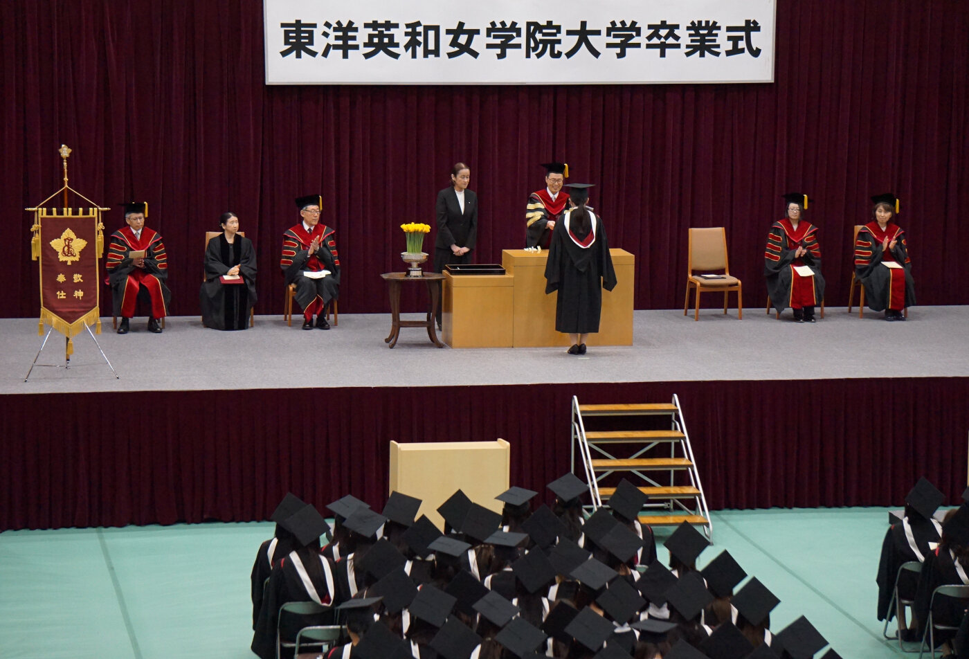 式典後には、卒業生一人ひとりに卒業証書・学位記、そして本学院の卒業式で新たな旅立ちを迎える卒業生に贈られてきた黄水仙が手渡されました。