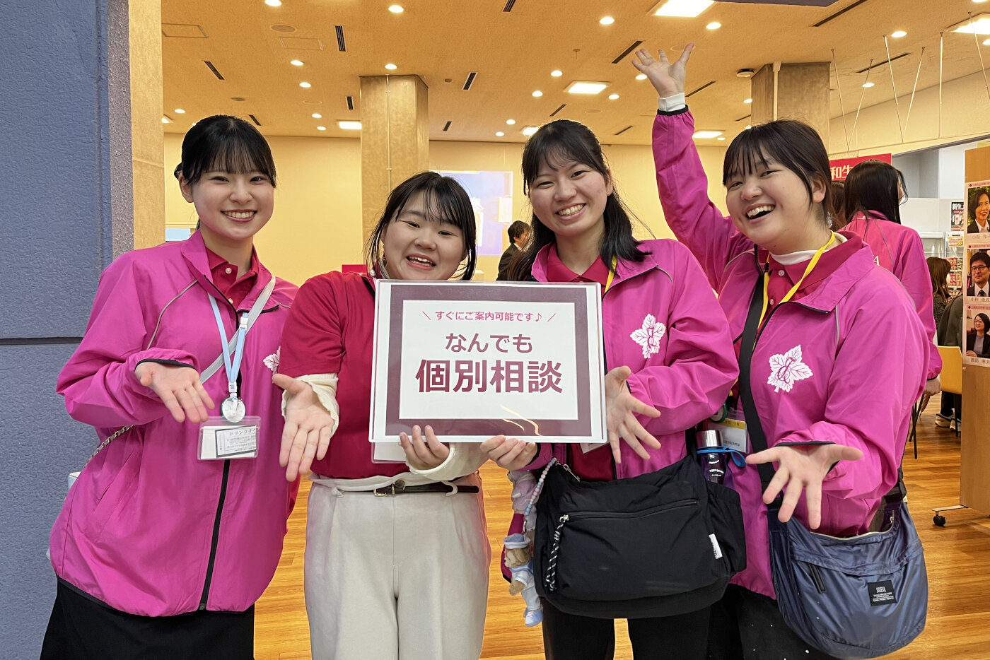 キャンパスツアーでは、春の光が差し込む校舎や充実した施設を英和生がご案内。個別相談ブースでは、入試や学生生活、奨学金など、気になる疑問に一つひとつ丁寧にお答えしました。