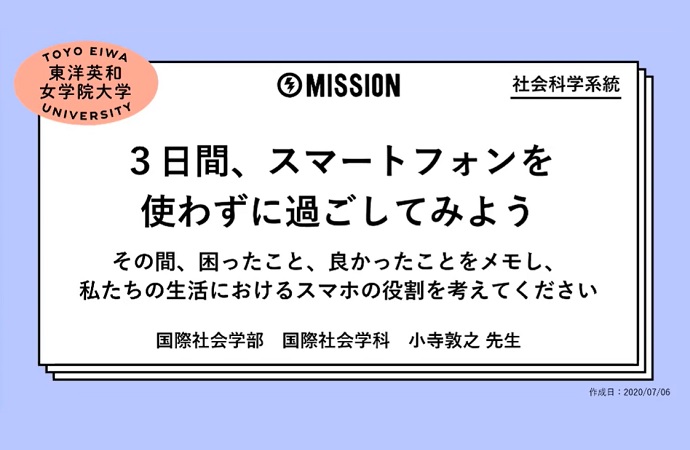 「3日間、スマートフォンを使わずに過ごしてみよう。その間、困ったこと、よかったことをメモし、私たちの生活におけるスマホの役割を考えてください」