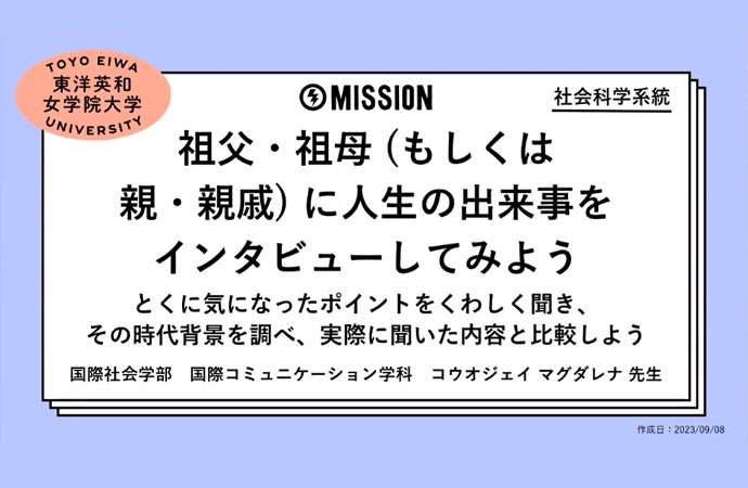「祖父・祖母(もしくは親・親戚)に人生の出来事をインタビューしてみよう。とくに気になったポイントをくわしく聞き、その時代背景を調べ、実際に聞いた内容と比較しよう」