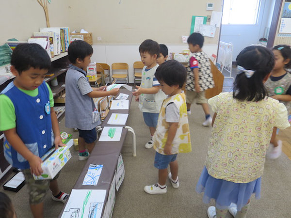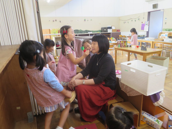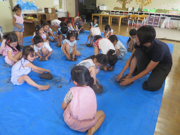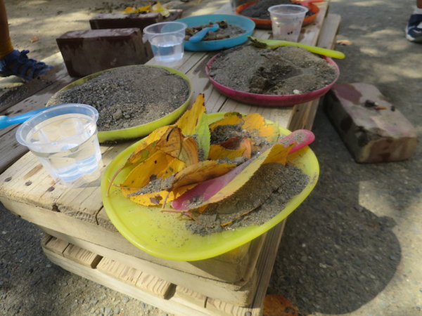庭の片隅ではドングリや葉っぱのごちそう作り