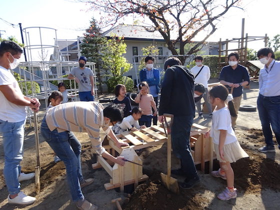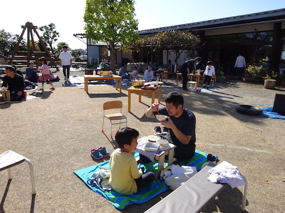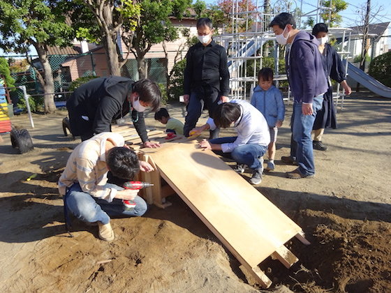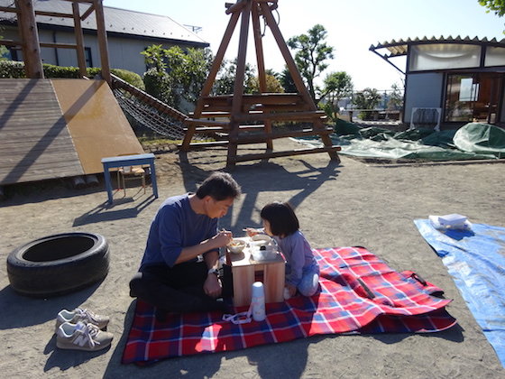 2020年11月29日 ワーク(お父さんとはたらく日)その2 はたらいた後は、お昼ごはんです。お家から持ってきたおにぎりと子どもたちが作った豚汁を食べました。 自分で作ったちゃぶ台をお父さんと囲んで食べました! デザートは庭のみかんです。 食後にもうひとがんばり。 すべり台の仕上げをしました。 前へ 一覧へ戻る 次へ