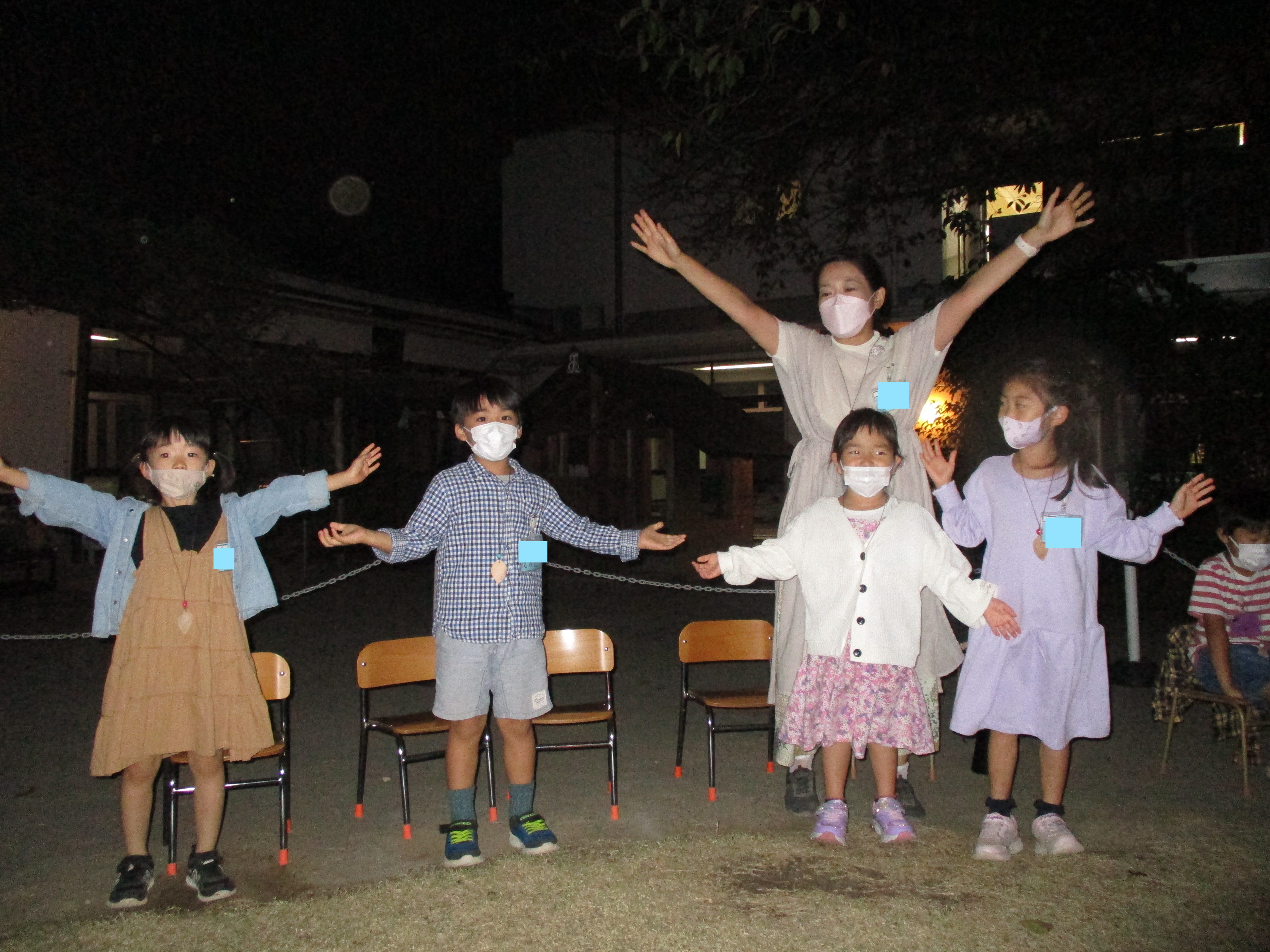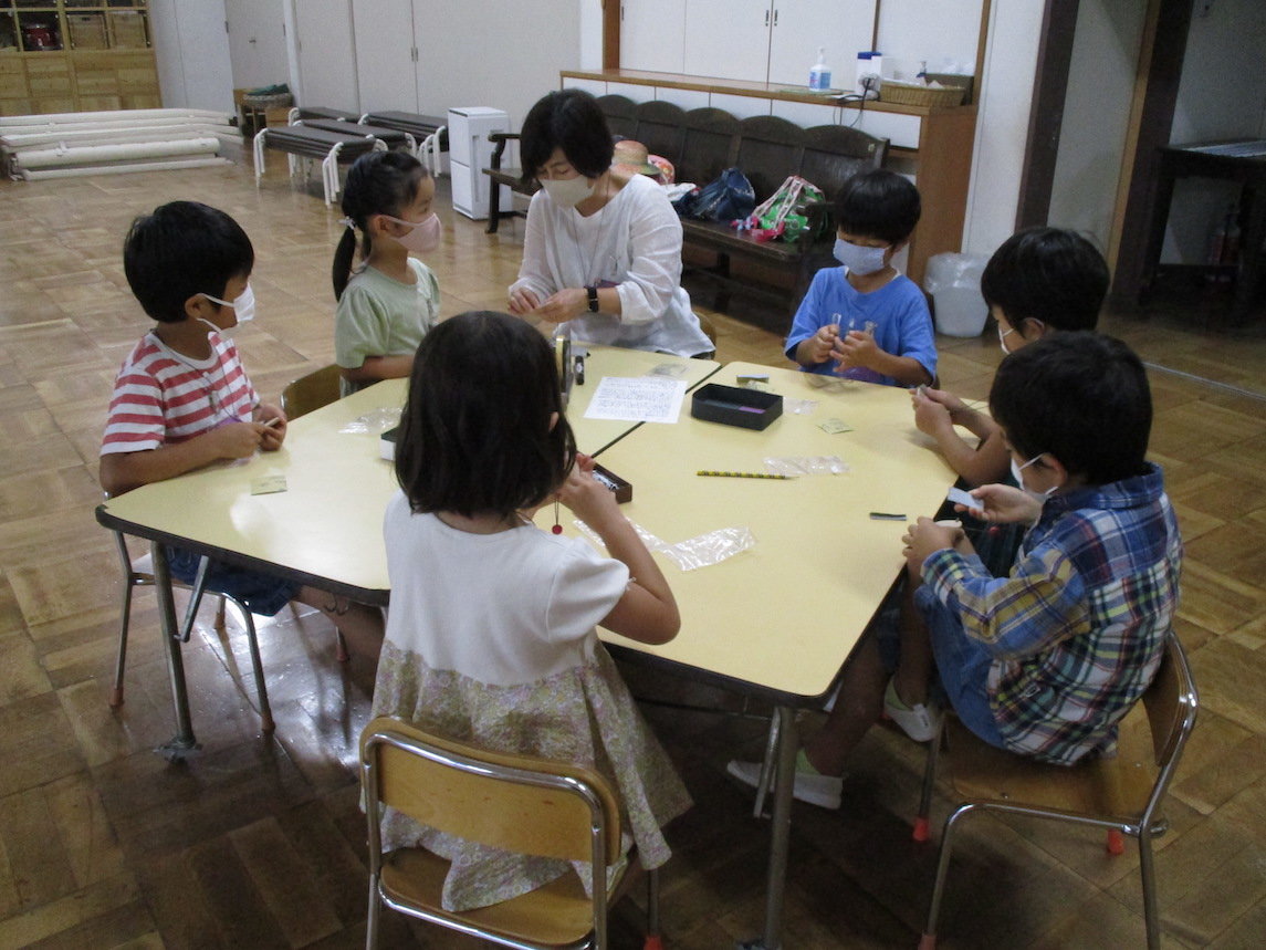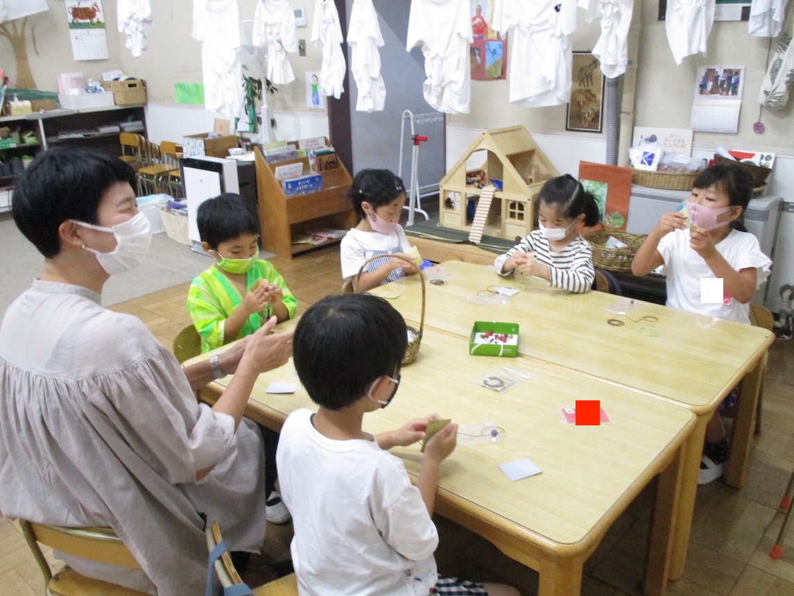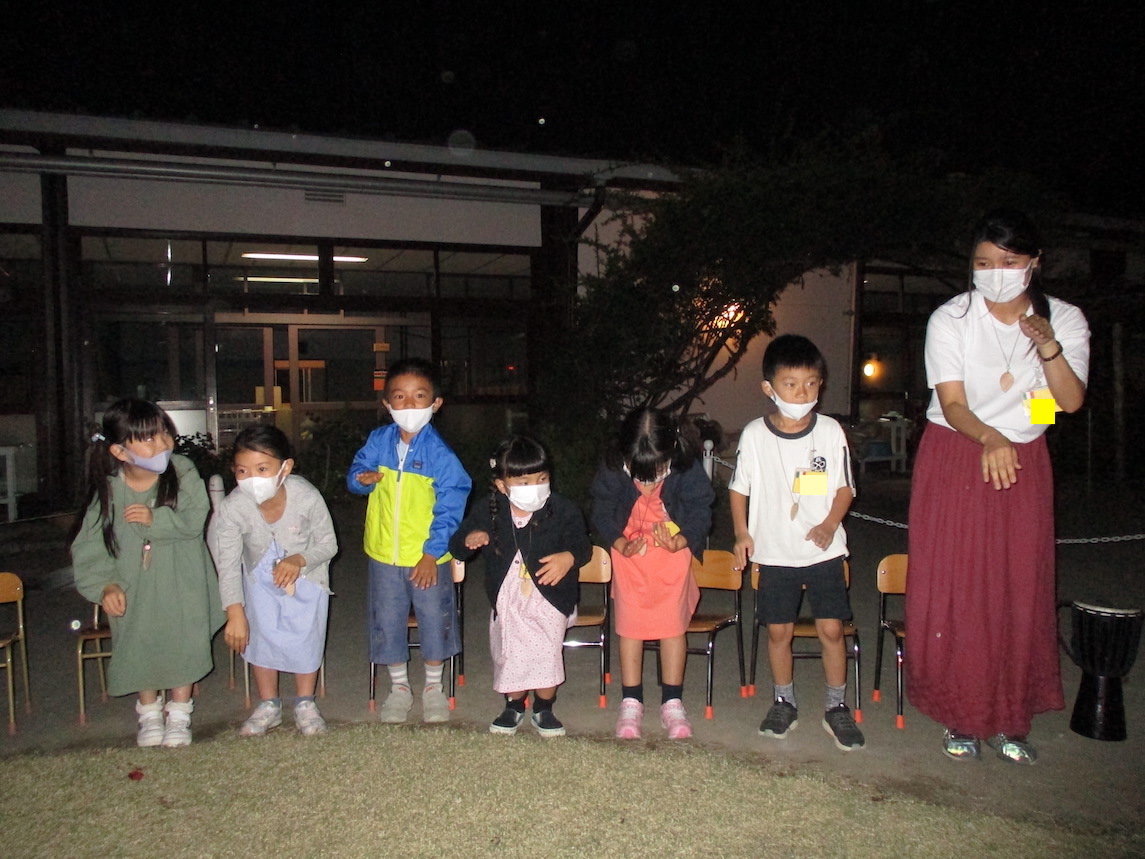 2021年10月10日 年長組「ゆうがたのようちえん」 夕方、年長組の子どもたちが幼稚園にやってきました。 今日のプログラムはペンダント作り、おやつ、火を囲んでの集い。 グループにわかれてクスノキのペンダントを作ります。 クスノキにヤスリをかけます。「いい匂い〜」 暗くなった庭に出て火を囲んで踊ったり、歌ったり・・・ いつもとは違う特別なひとときを過ごしました。 前へ 一覧へ戻る 次へ