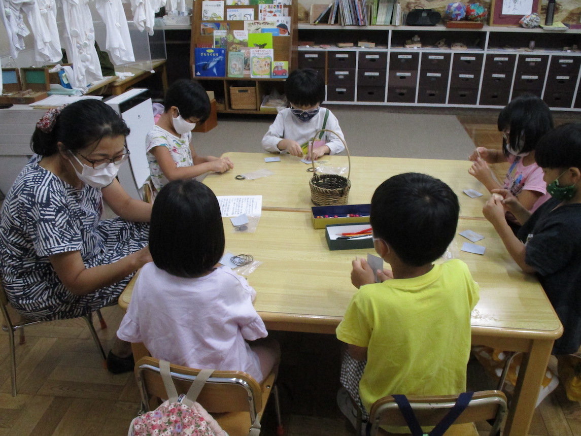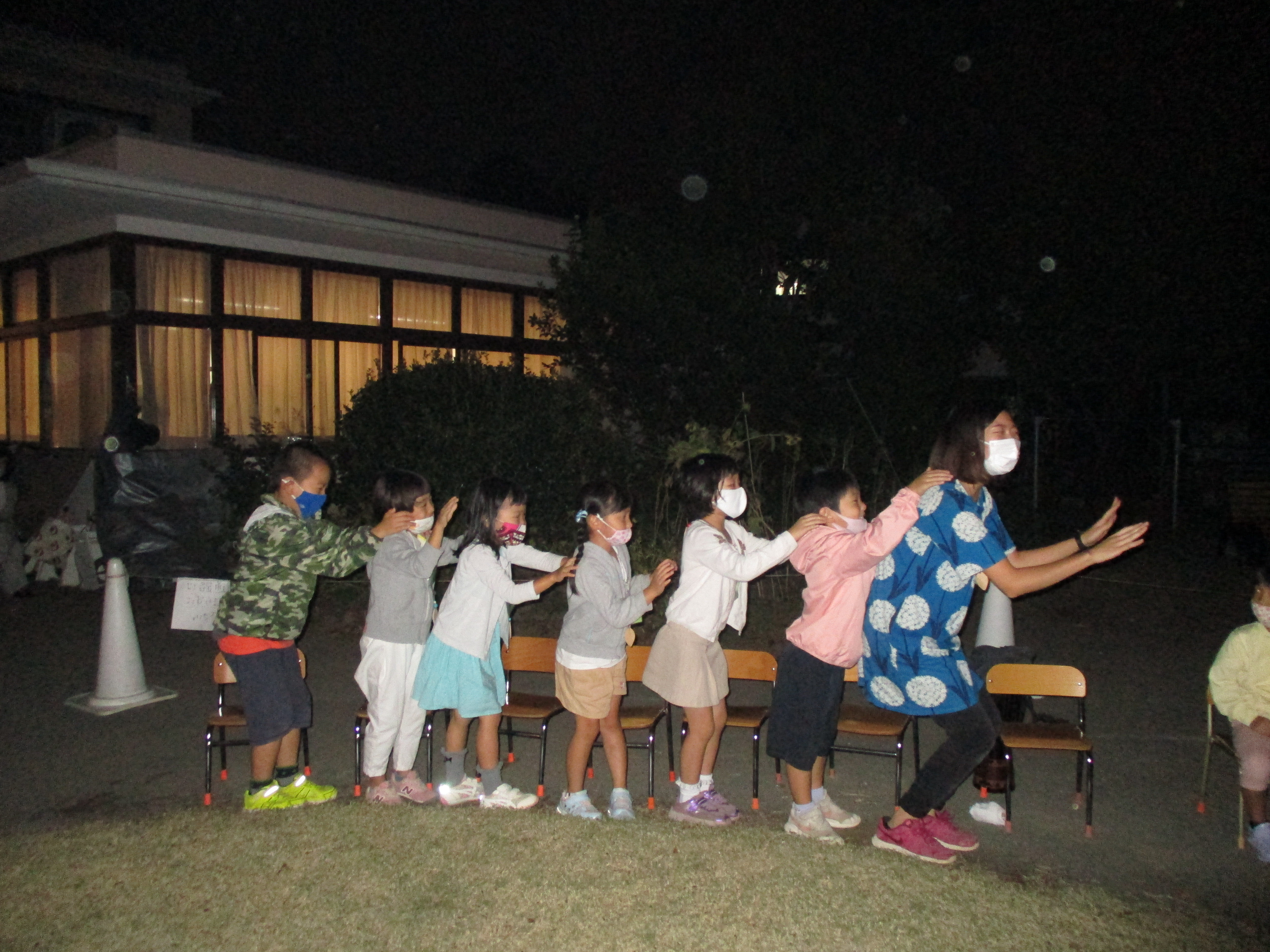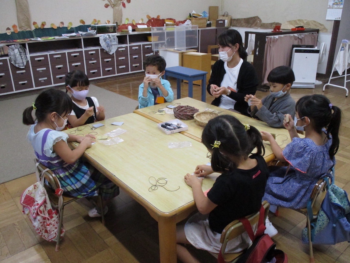 2021年10月10日 年長組「ゆうがたのようちえん」 夕方、年長組の子どもたちが幼稚園にやってきました。 今日のプログラムはペンダント作り、おやつ、火を囲んでの集い。 グループにわかれてクスノキのペンダントを作ります。 クスノキにヤスリをかけます。「いい匂い〜」 暗くなった庭に出て火を囲んで踊ったり、歌ったり・・・ いつもとは違う特別なひとときを過ごしました。 前へ 一覧へ戻る 次へ