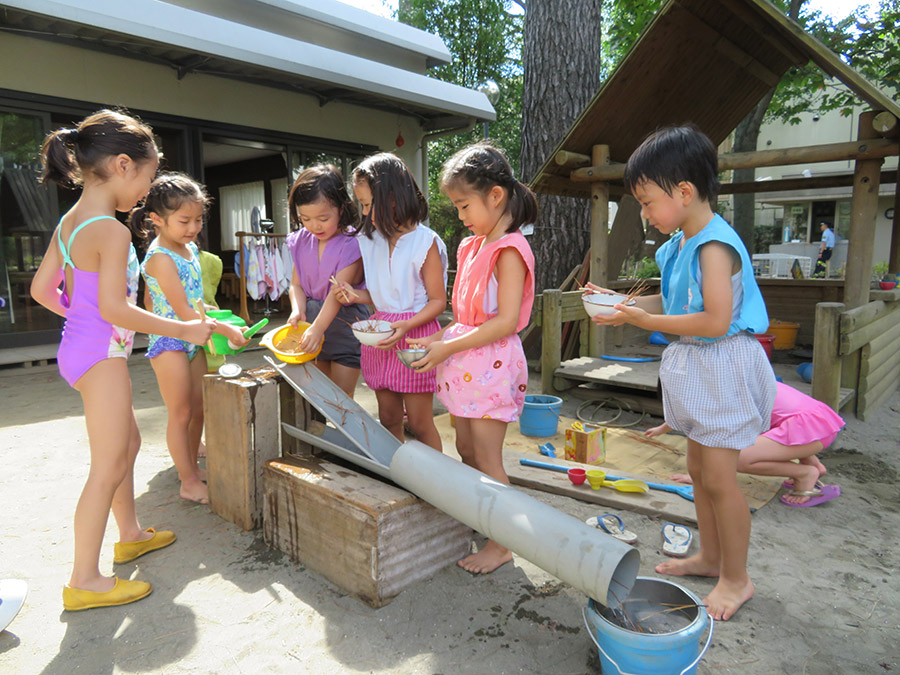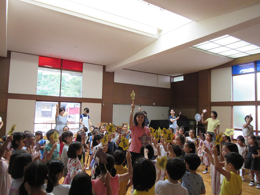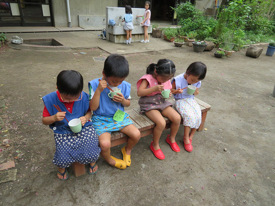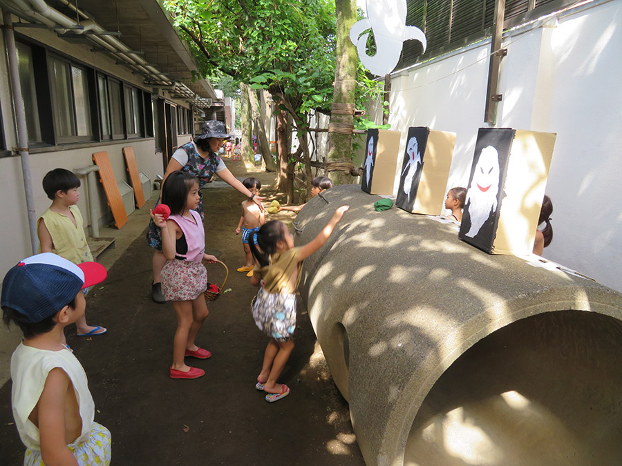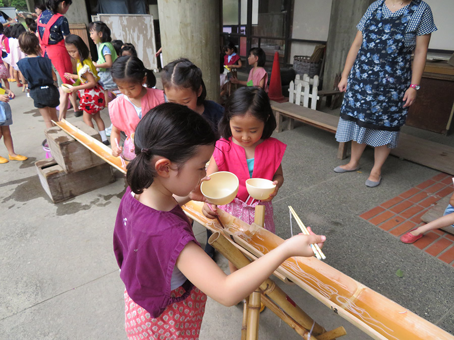 東洋英和幼稚園だより なつまつり おしょうゆ入れの金魚、たくさんすくえるかな? おばけの的あて えいっ!なかなかたおれないねぇ 流しそうめん あ~流れていっちゃったぁ おやつにおいしくいただきました。 おまつりの最後はみんなで集まって英和音頭を踊りました。 翌日…さっそく松葉のそうめんを使って、やかんの代わりにじょうろ、器の代わりに砂場のカップを手に、そうめん流しごっこがはじまりました。 前へ 一覧へ戻る 次へ