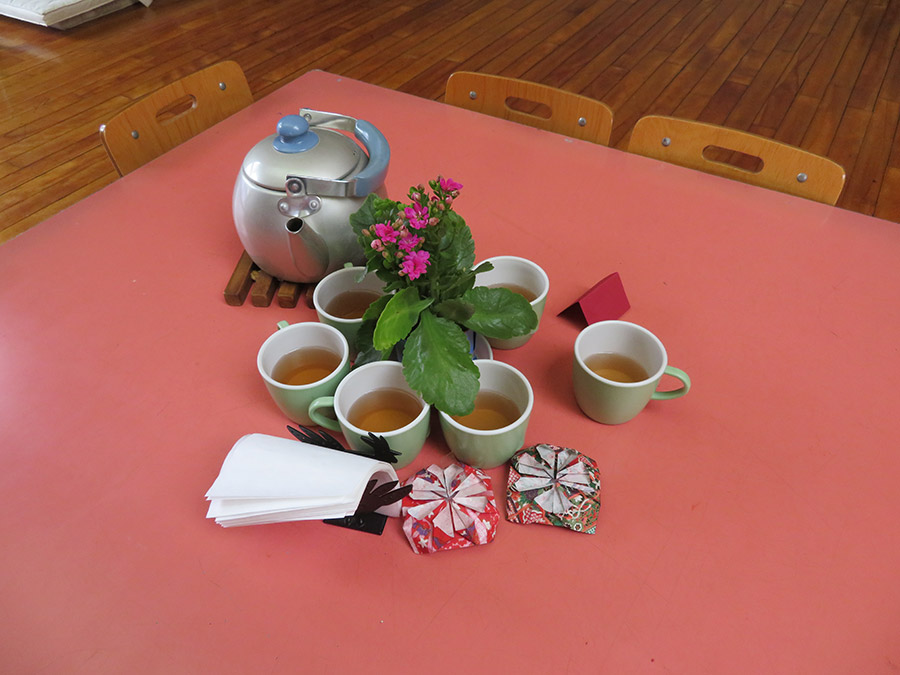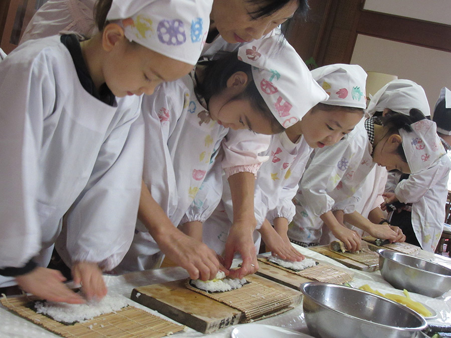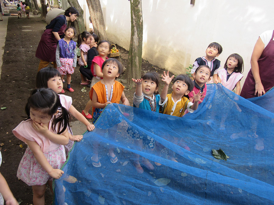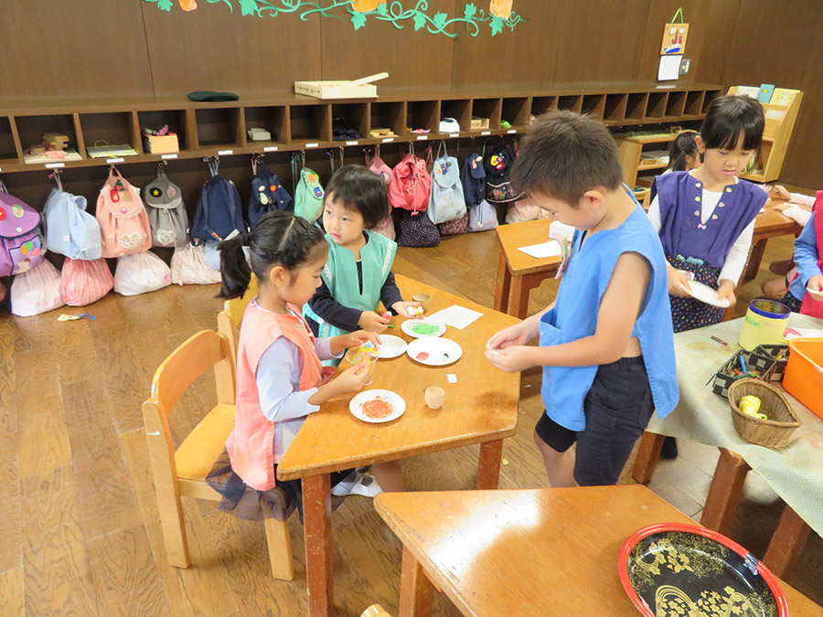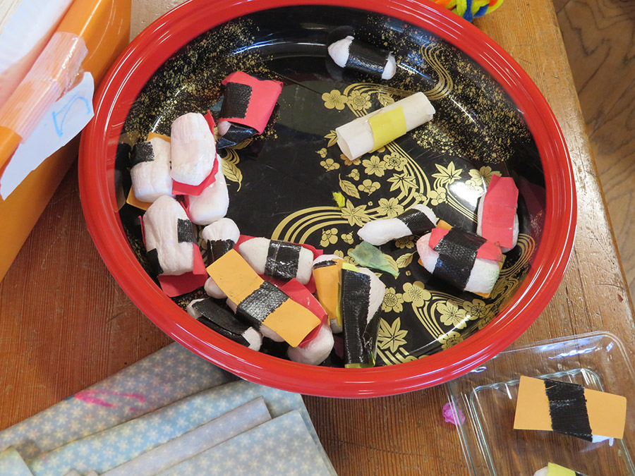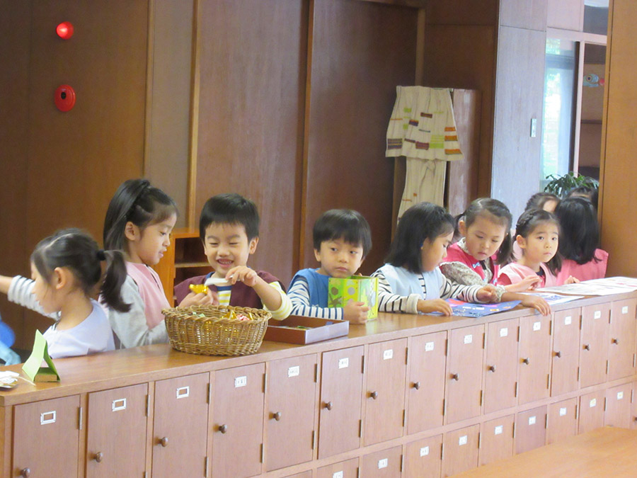 東洋英和幼稚園だより 10月の様子(その1) 裏庭に実った柿をかきたろうさん達と一緒に屋根に上って採りました。 その下ではネットを広げて落ちてくる柿を今か今かと待ち構えています。 年長組の部屋に回転ずしやさんがオープンしました。 梱包材と色紙でできたお寿司です。なかなかおいしそう! あまり夢中になっているので、本当のお寿司を作ってパーティーを開くことになりました。 買い物グループはお花屋さんに買い物に出かけます。 飾りグループは作った飾りを手に出番を待ちます。 お花を飾り、お茶も入れて準備ができました。 前へ 一覧へ戻る 次へ