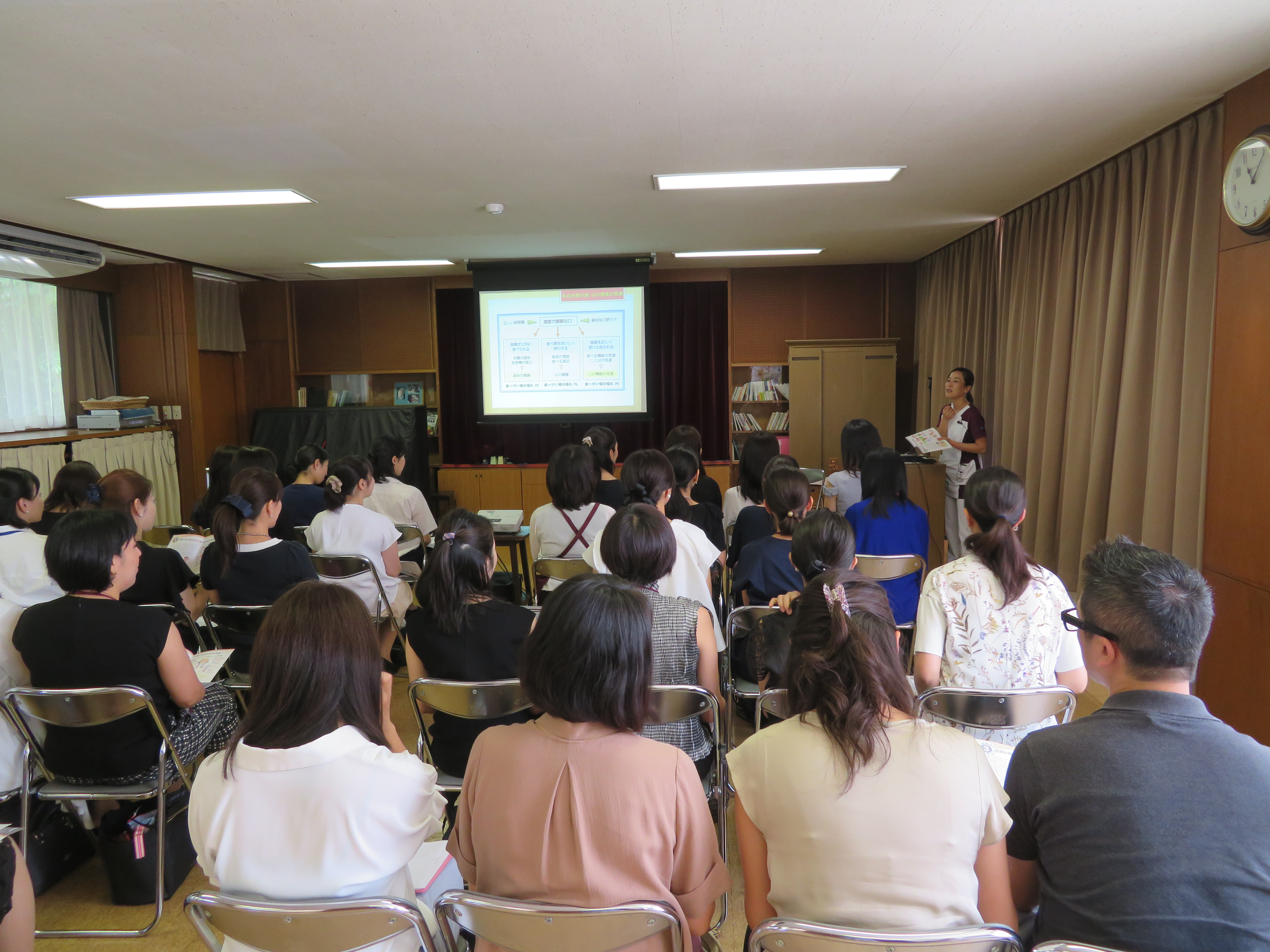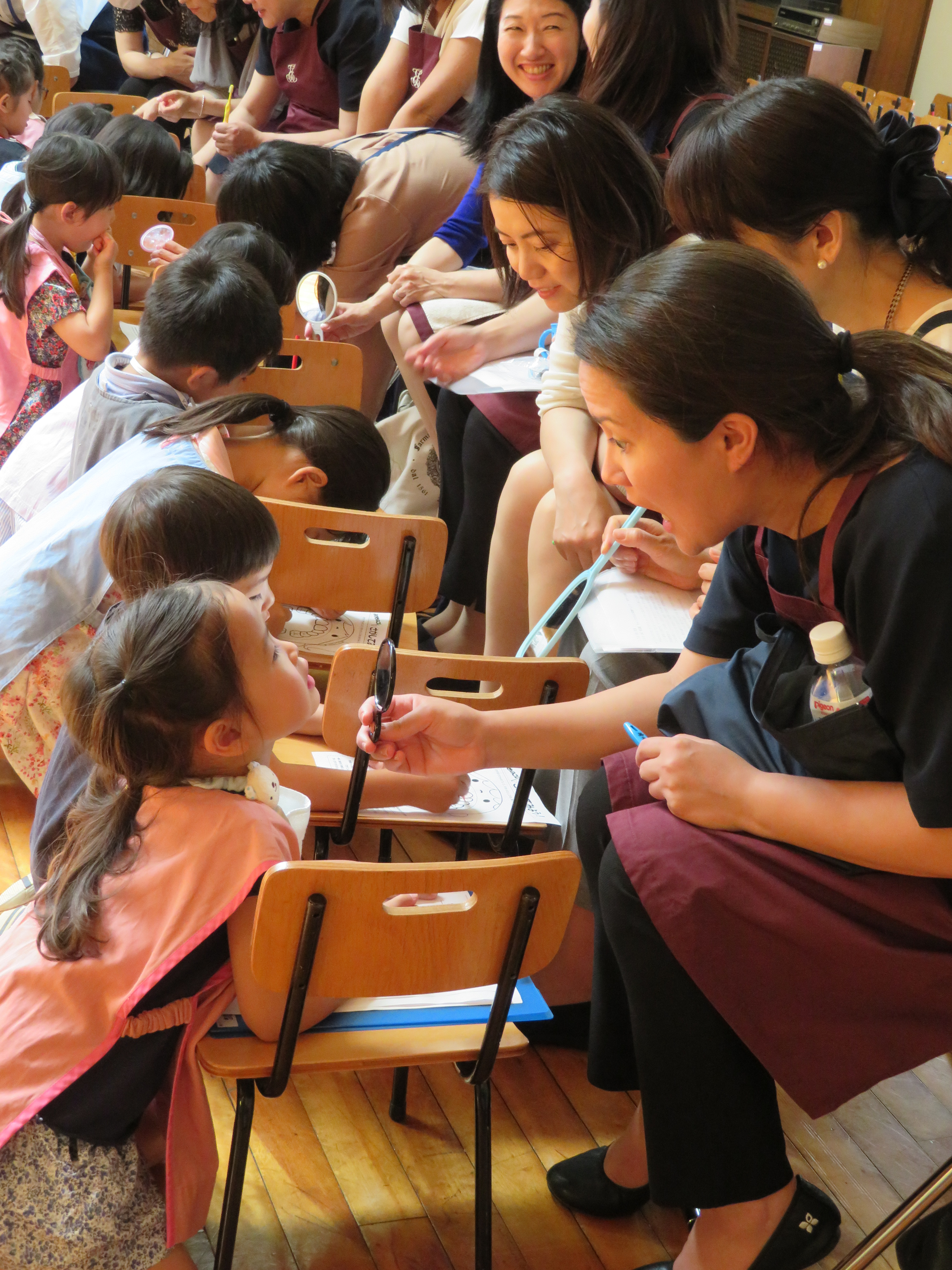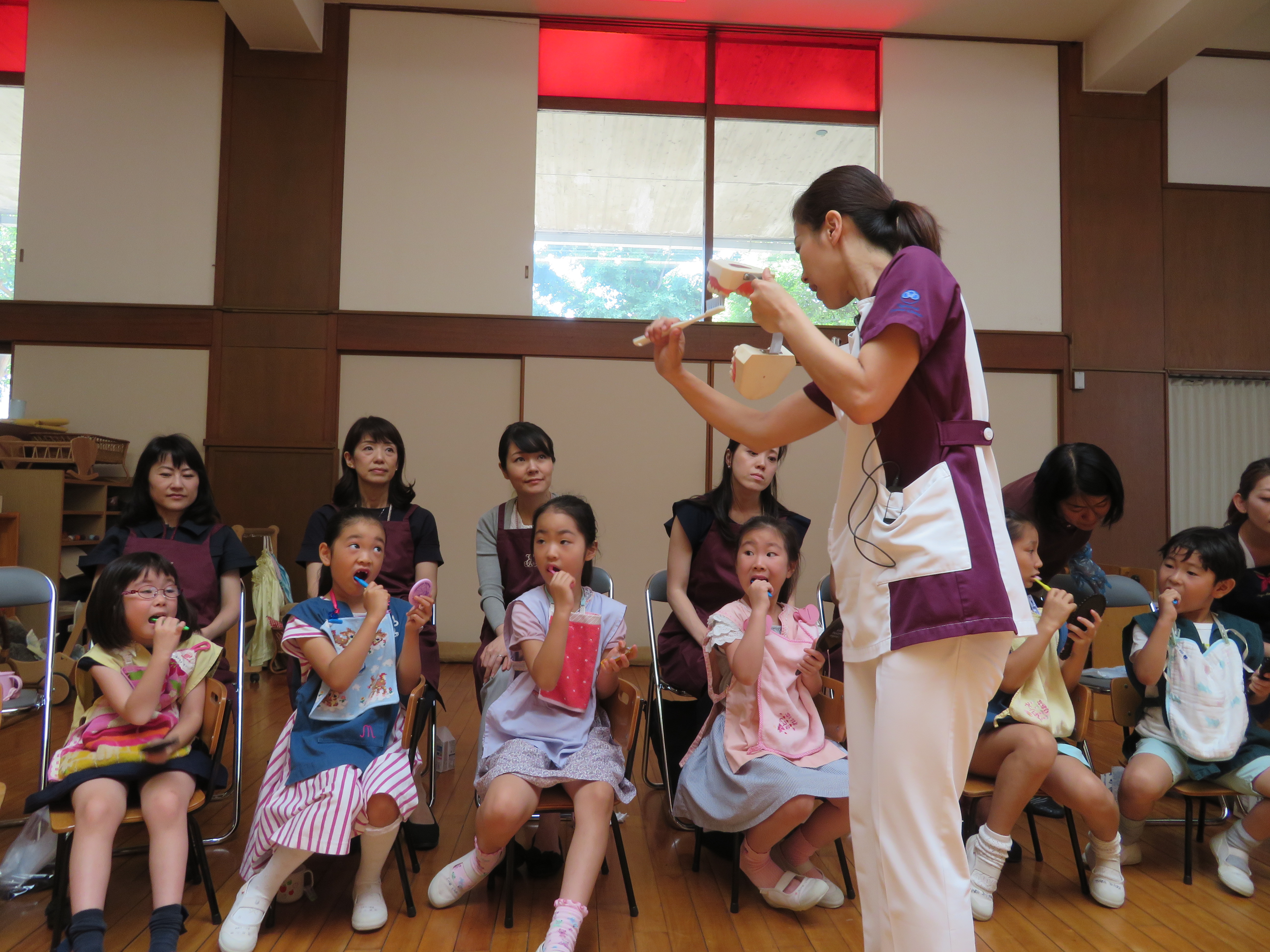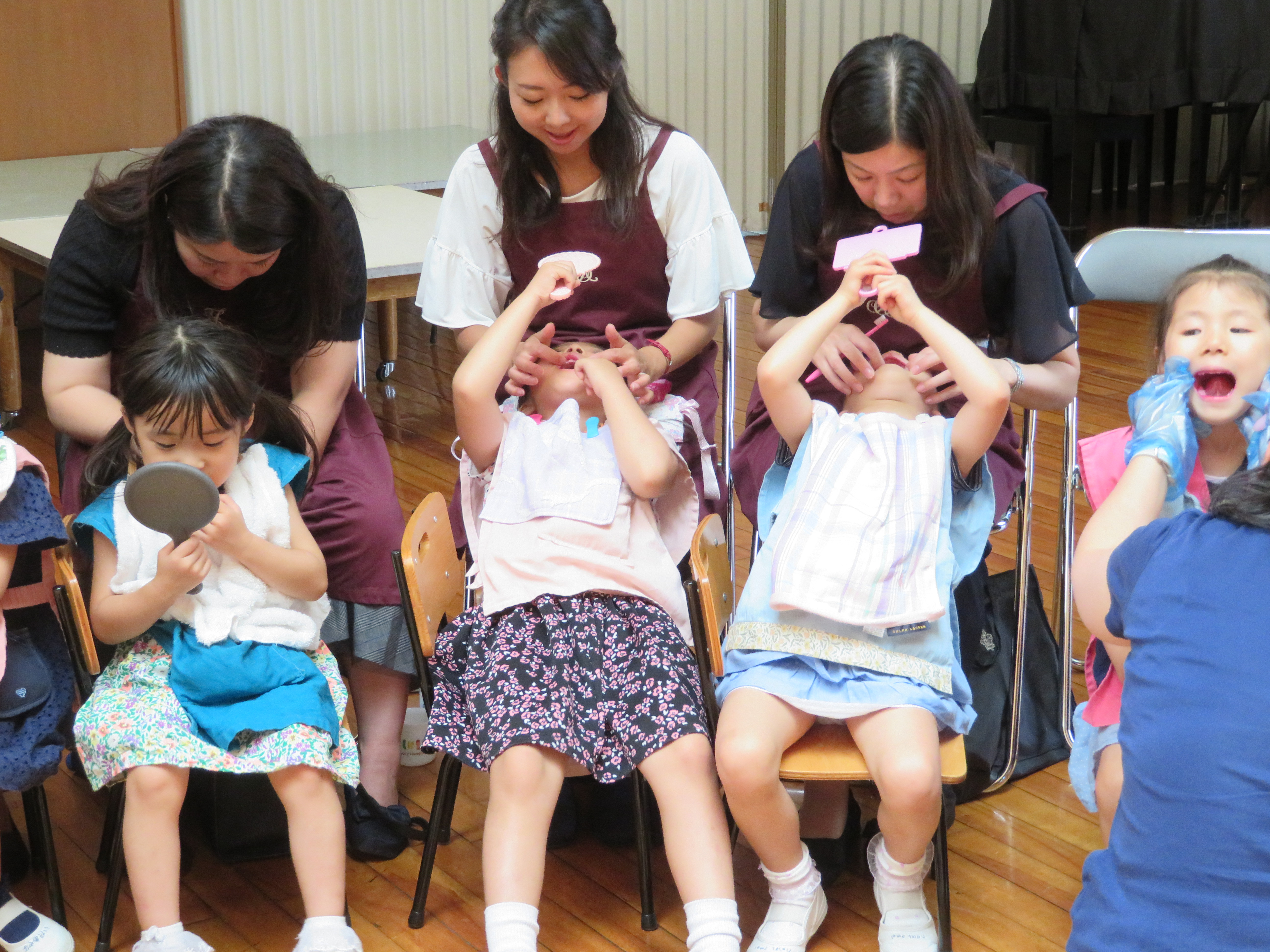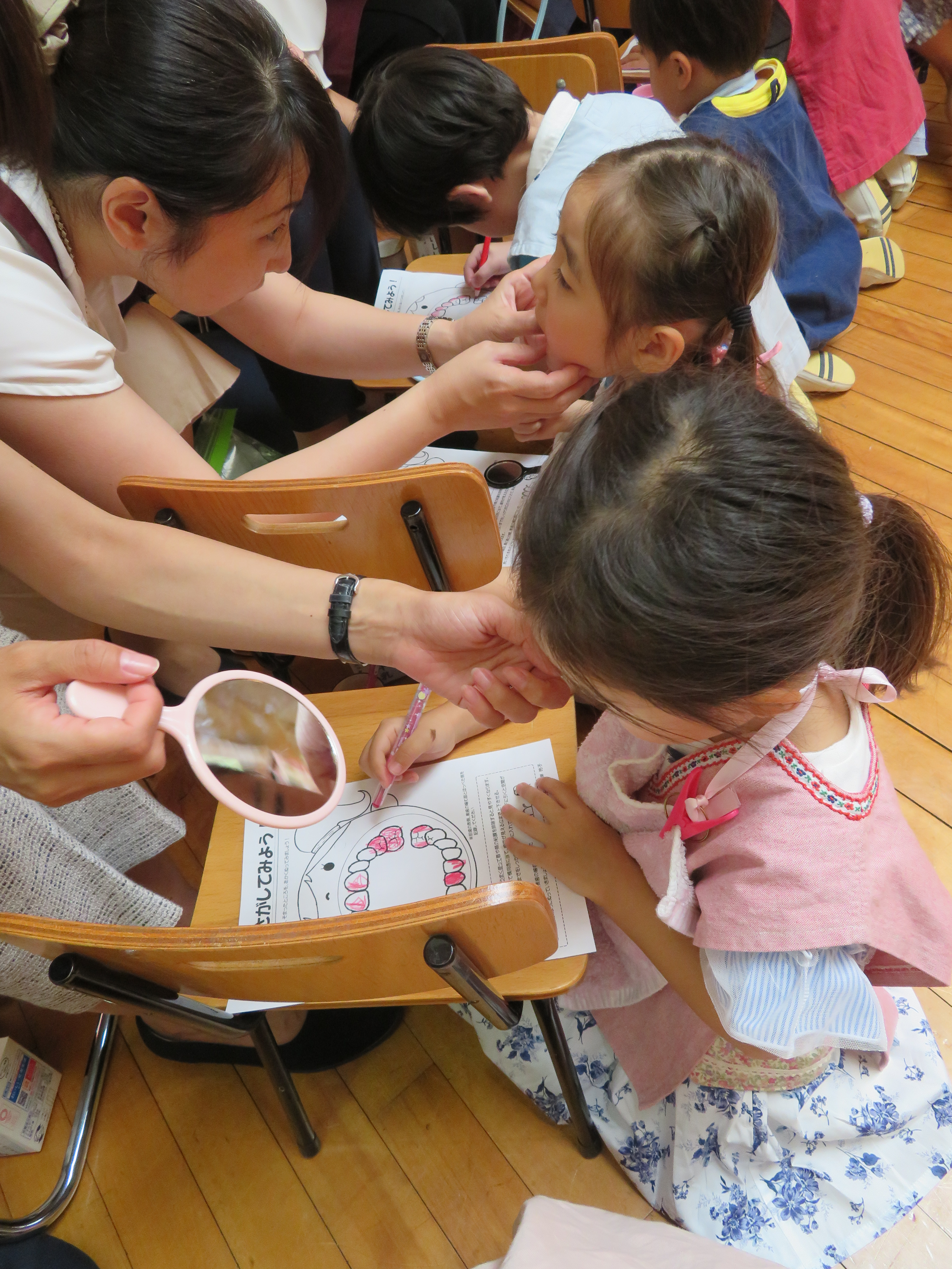 東洋英和幼稚園だより 歯磨き指導 6月6日 年中・年長組の親子が歯科衛生士の岸先生に歯の磨き方を教えていただきました。 向かい合って、どこがきれい?どこが汚れてる? 汚れがたまっているところを親子で真剣に確認しました。 上の歯は、歯ブラシを“さようなら”の向きにして・・・ 「仕上げ磨きは、お母さん、よろしくね」 保護者の方には、より詳しく説明もしてくださいました。 前へ 一覧へ戻る 次へ