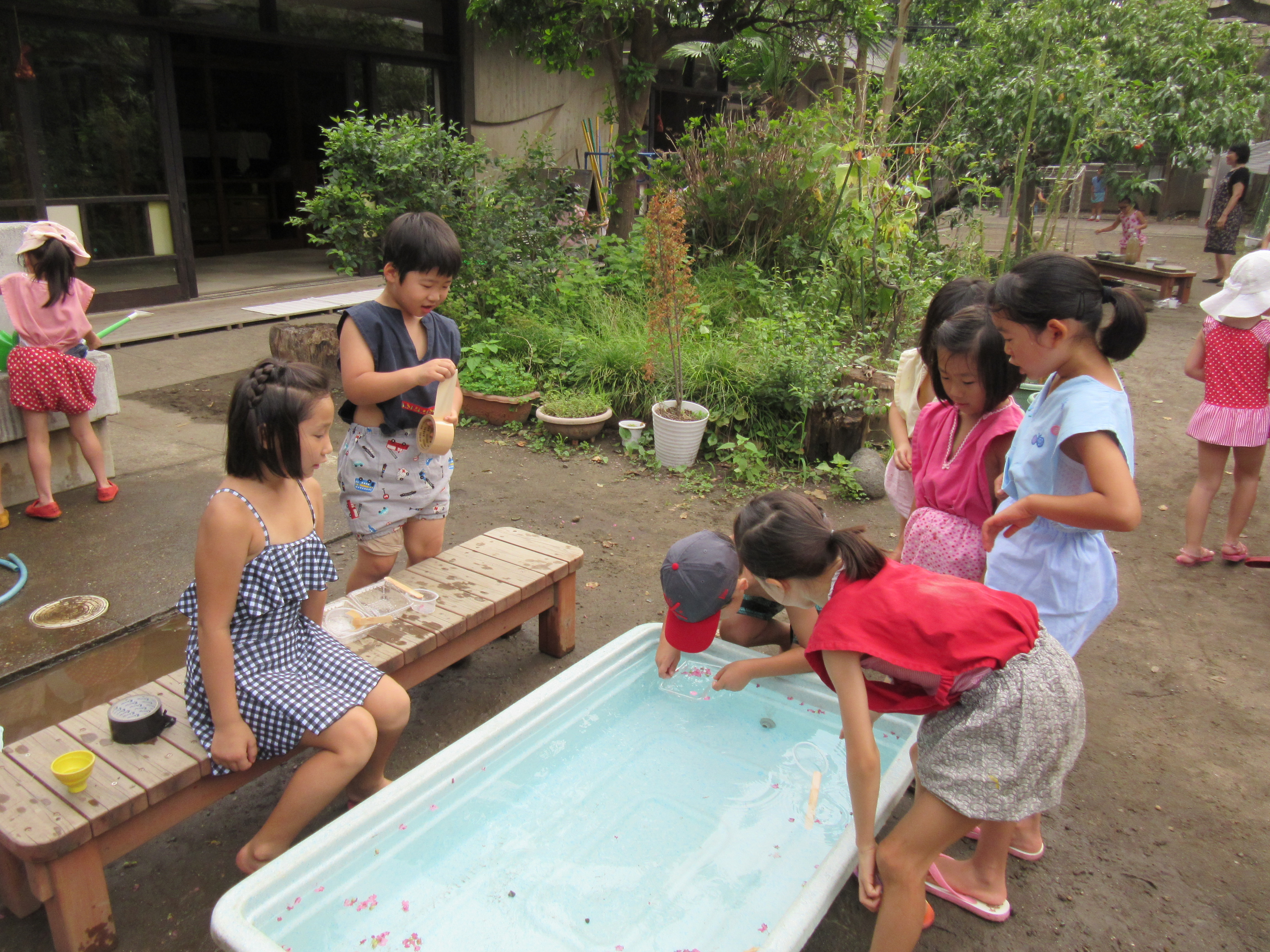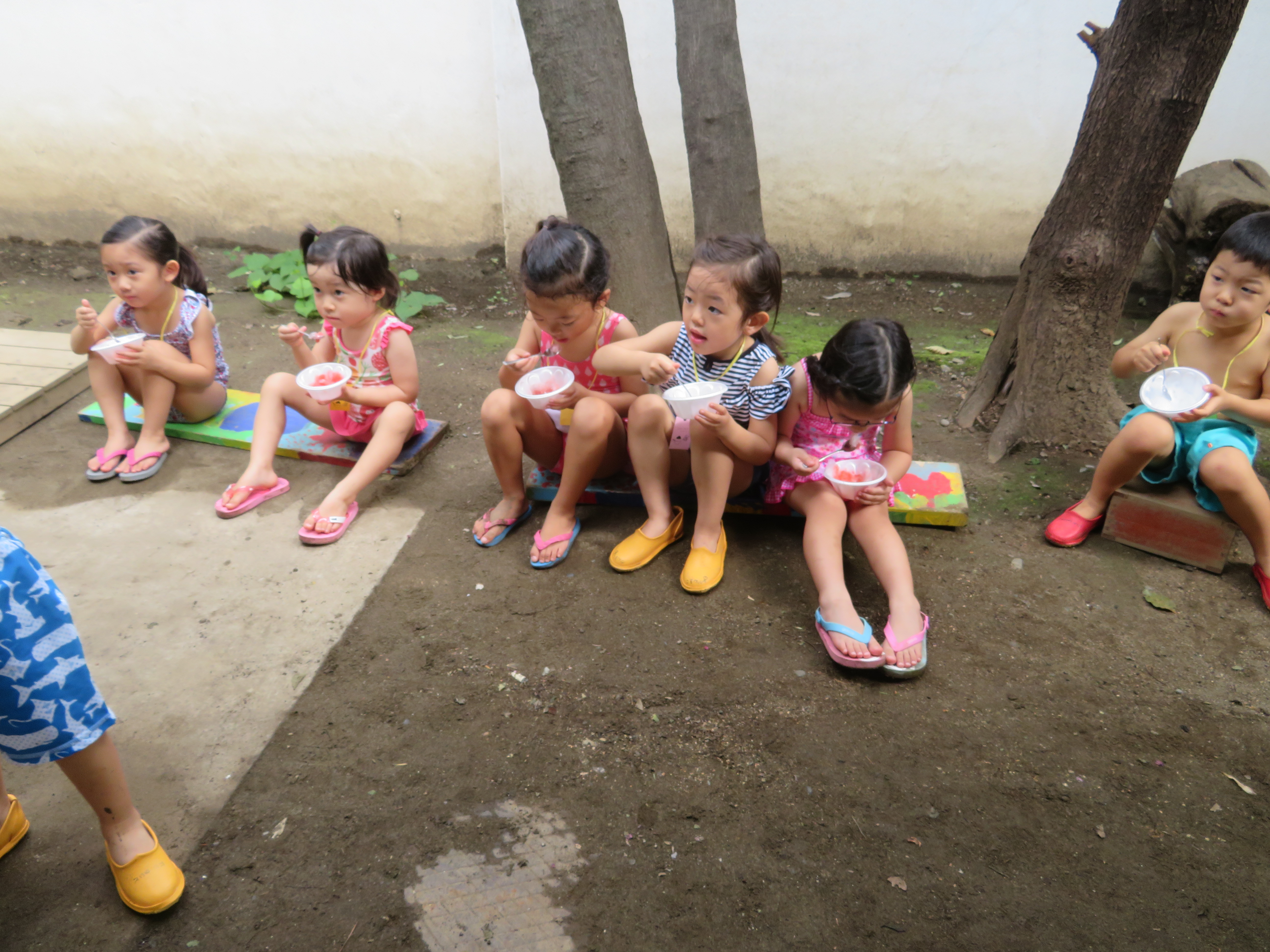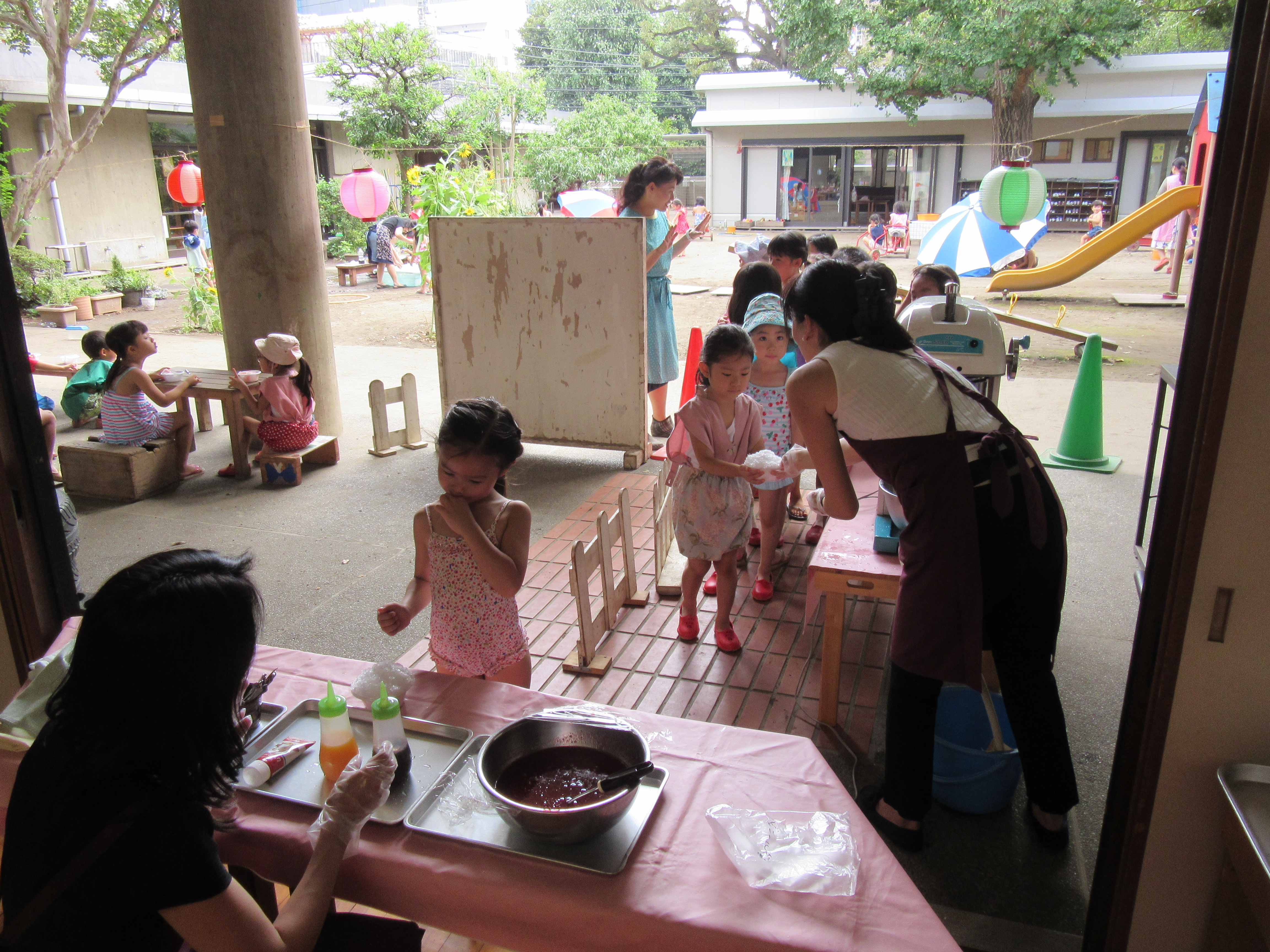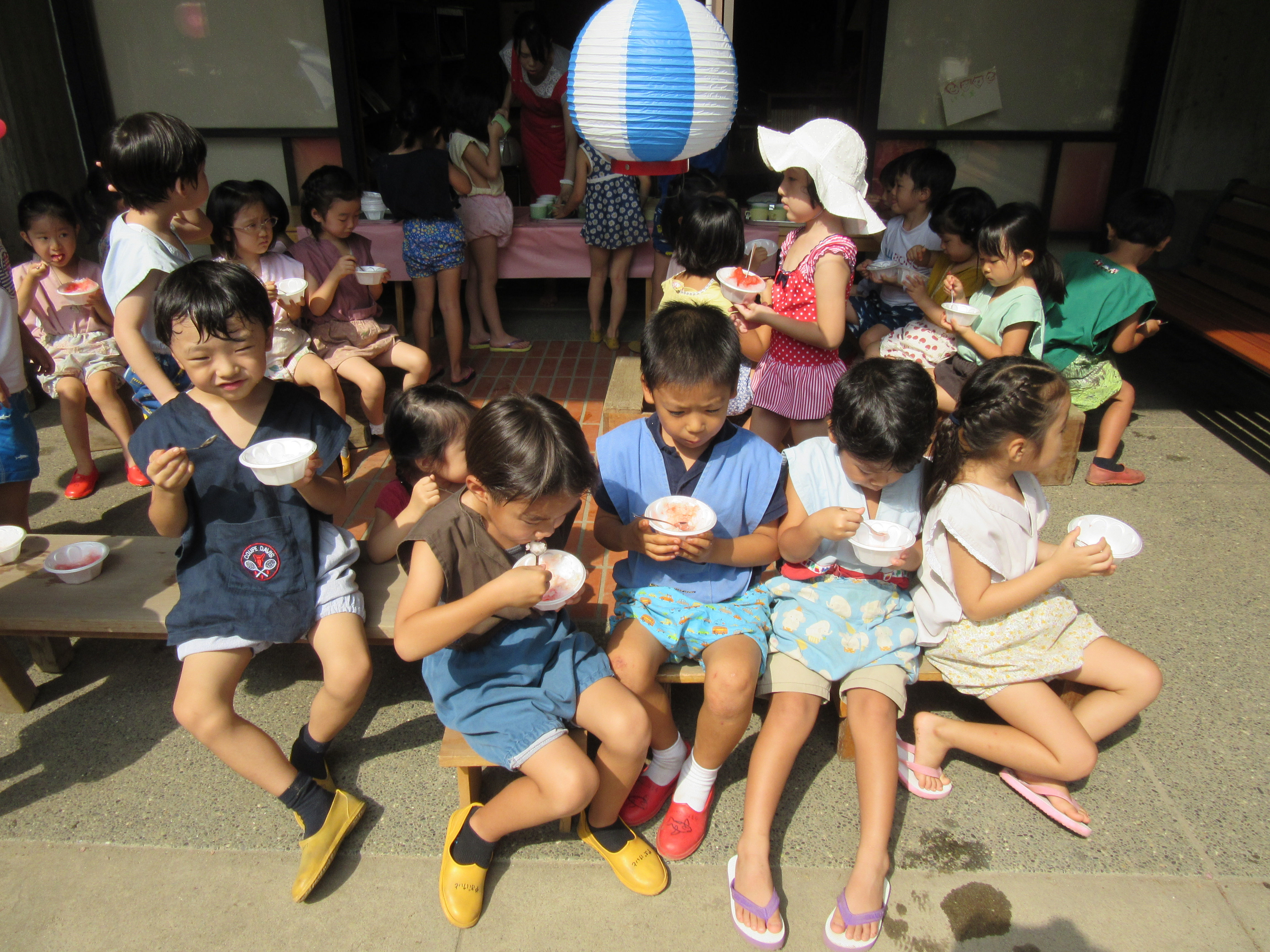 東洋英和幼稚園だより 9月の様子(その2) まだ夏の日差しが残る頃、おやつにかき氷をいただきました いちご・オレンジ・グレープ・・・んー何味にしよう? もくもくと食べています 冷たくて、あーおいしい! お祭り気分で、金魚すくいならぬ、花びらすくいもはじまりました 前へ 一覧へ戻る 次へ