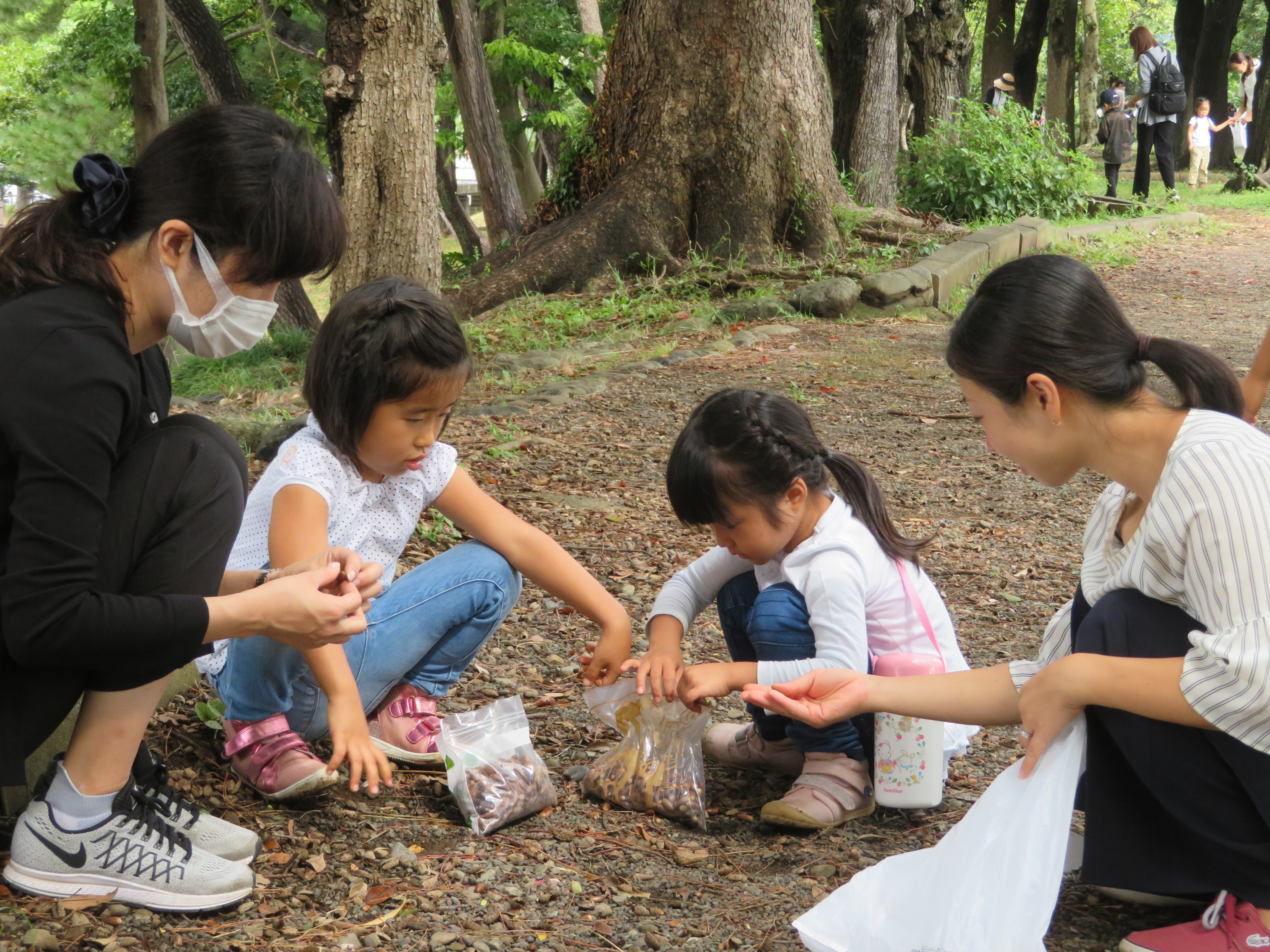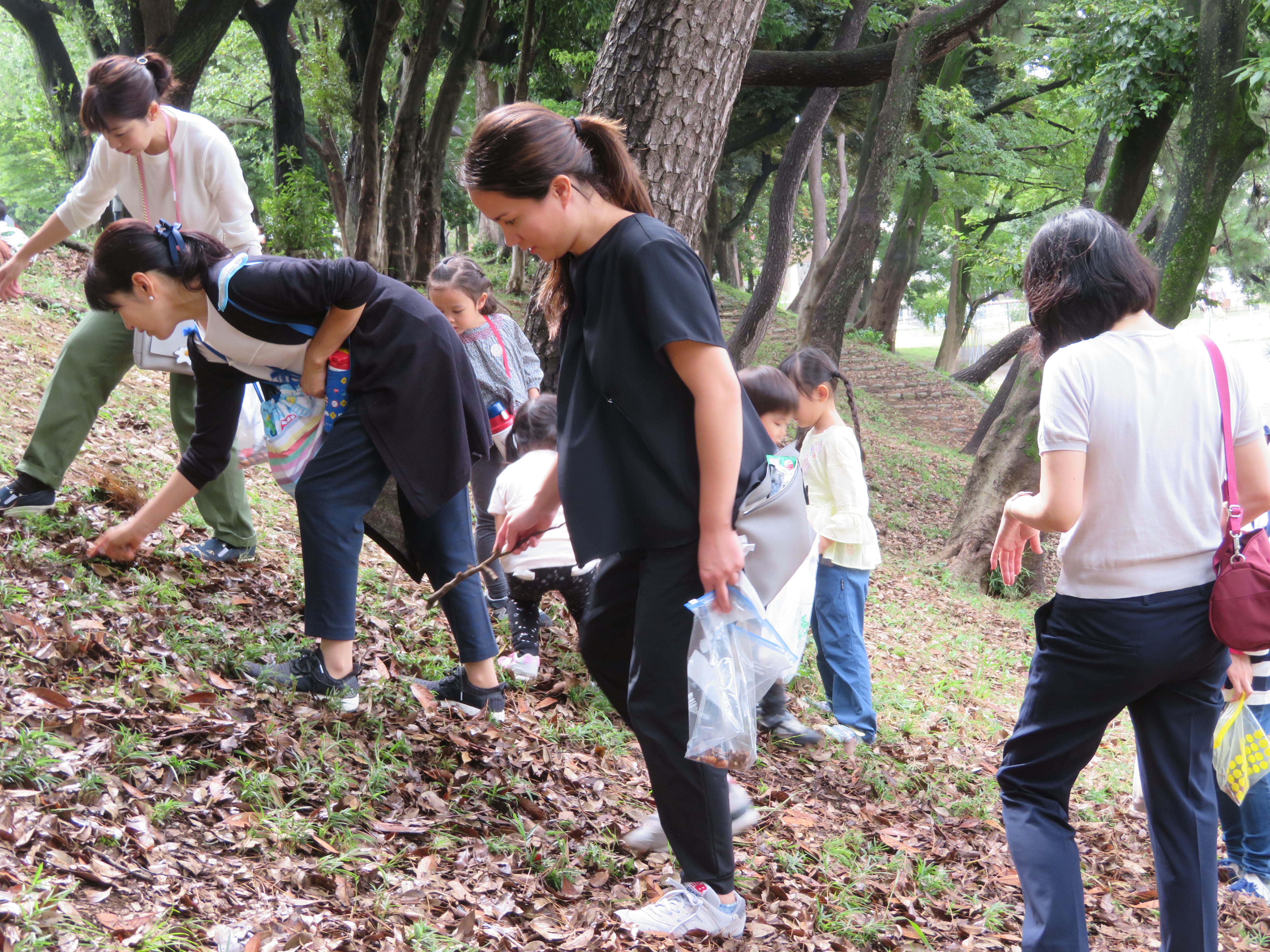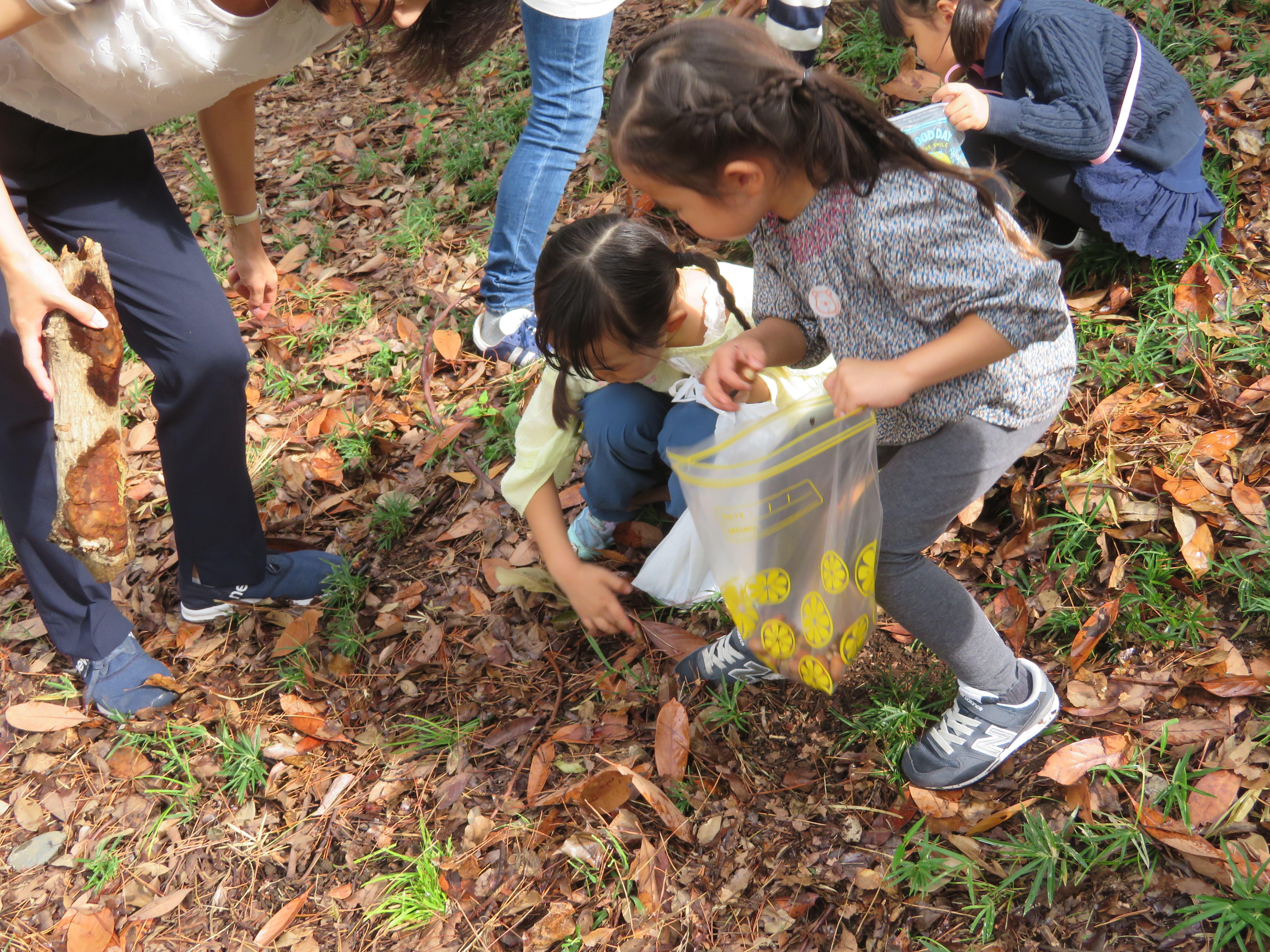 東洋英和幼稚園だより 園外保育 どんぐり拾い 10月8日(年中組) 福島にある幼稚園へどんぐりを送るために、お母様と共に、幼稚園から近くの公園へ出かけどんぐり拾いをしました しゃがみこんで、1つ1つ拾っていきました 足の踏み場もないほどたくさん落ちています 葉をかきわけてみると、出てくる出てくる お母様も夢中になって探しています たくさん拾った後は、お弁当をいただき 鬼ごっこなどもして楽しみました 「赤ちゃんどんぐりも送ろう」とどのようにして送るか相談しています 前へ 一覧へ戻る 次へ